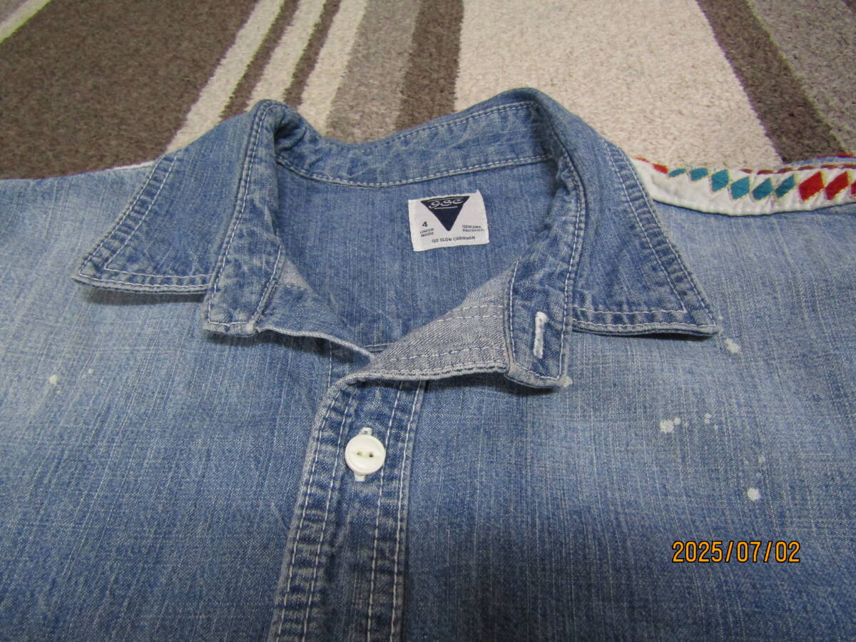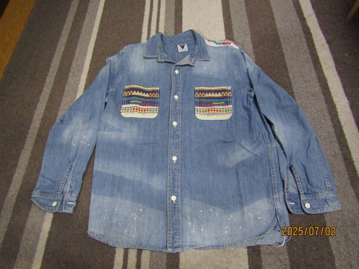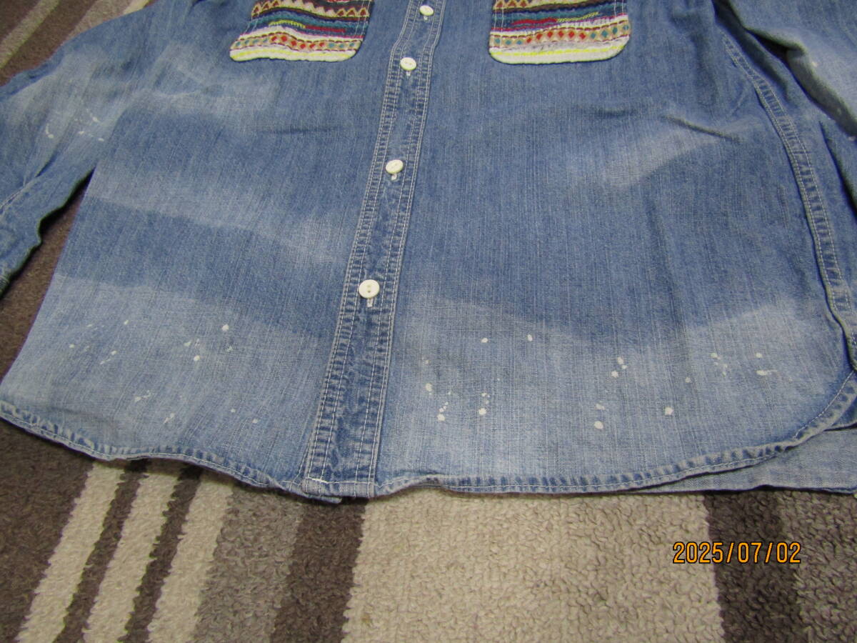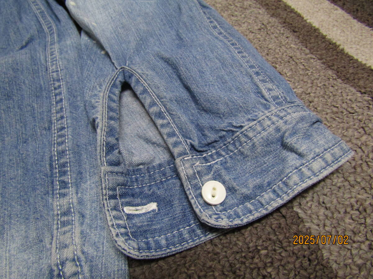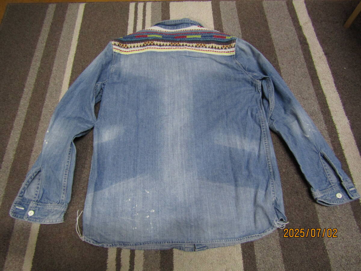 サイズがよくわかりませんが、M位だと思います。実寸ですが、肩幅約43㎝、身幅(脇下部分)約51㎝、裾幅約48㎝、着丈(背中側の襟下から裾迄)約71㎝、袖丈(肩から袖先まで)右約60㎝、左約60、5㎝です。丁寧に測っておりますが、測り方により多少の誤差が出ることはご理解ください。着用感はありますが、目立ったダメージはありません。状態につきましては私の主観ですので、古着にご理解のある方のご入札をお願いいたします。