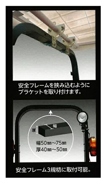 | 適合型式等 | 本体寸法(mm) 巾 1,010 全長1,250 高さ170 可動角度 85度 総重量 10.8Kg 安全フレーム(角パイプ)適応サイズ(mm) 巾50~75 厚さ 40~50 素材 スチール 屋根部 PP(ポリプロビレン) |