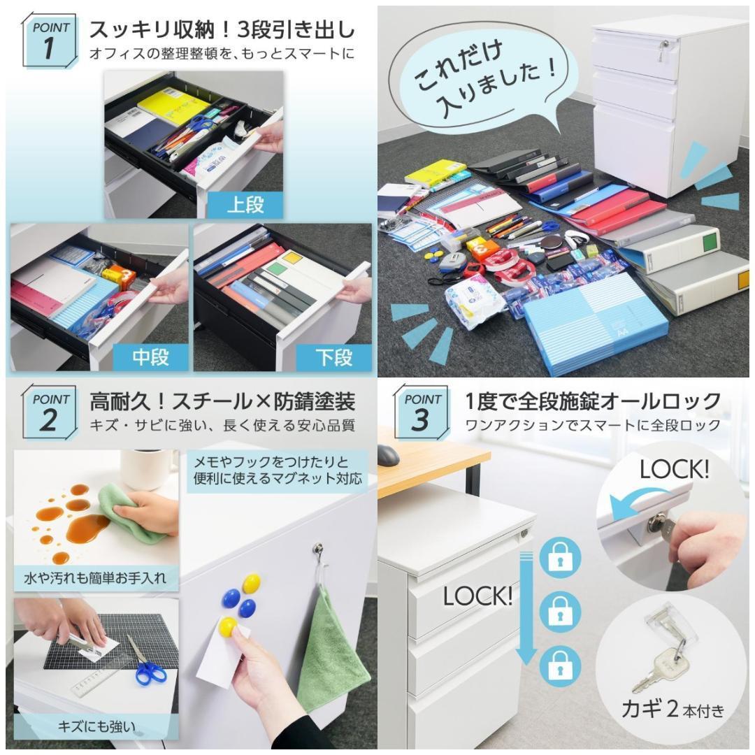 3段 スチール製 デスクワゴン おしゃれ 完成品 キャスター付き サイドワゴン 鍵付き シリンダー錠 3段オールロック