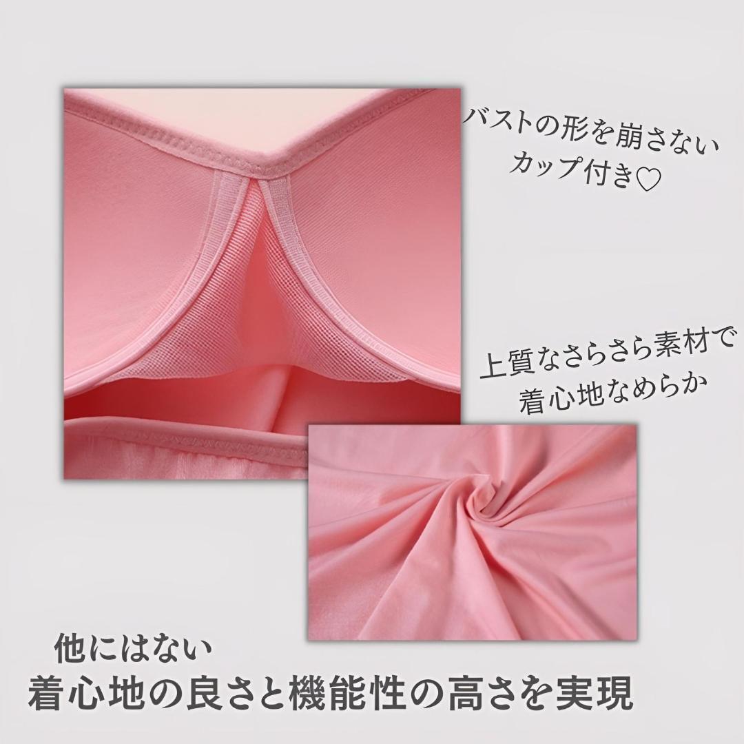 下着なしでも着られる安心の設計。お出かけにもおうち時間にも、ストレスフリーで快適に過ごせます。ナイトウェアやパジャマとしてはもちろん、ヨガやダンスなどの軽いスポーツシーンにも対応できる動きやすさが魅力です。