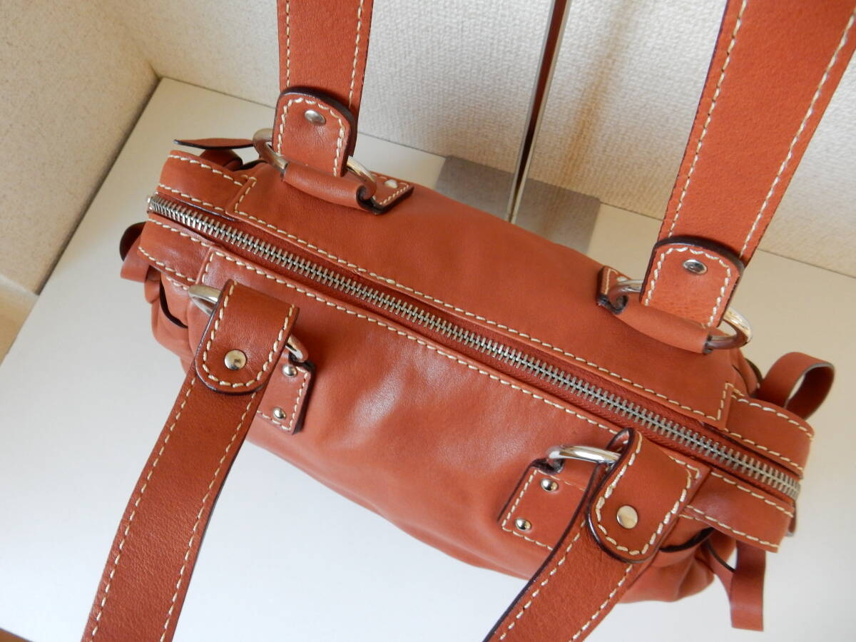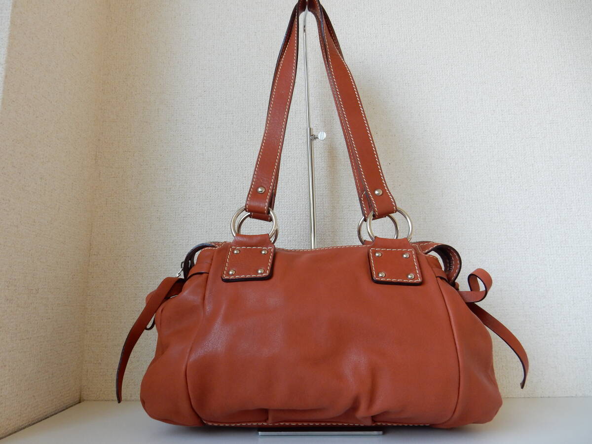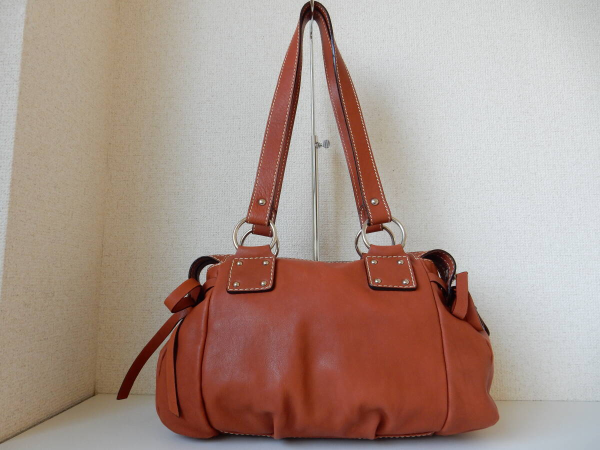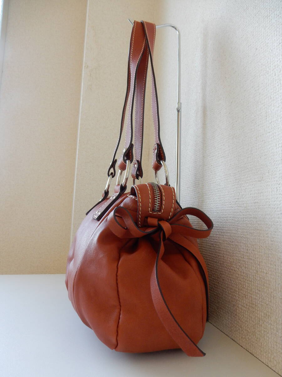 丸みを帯びたフォルムにサイドリボンがアクセントとなったダブルハンドルの本革ショルダーバッグ。