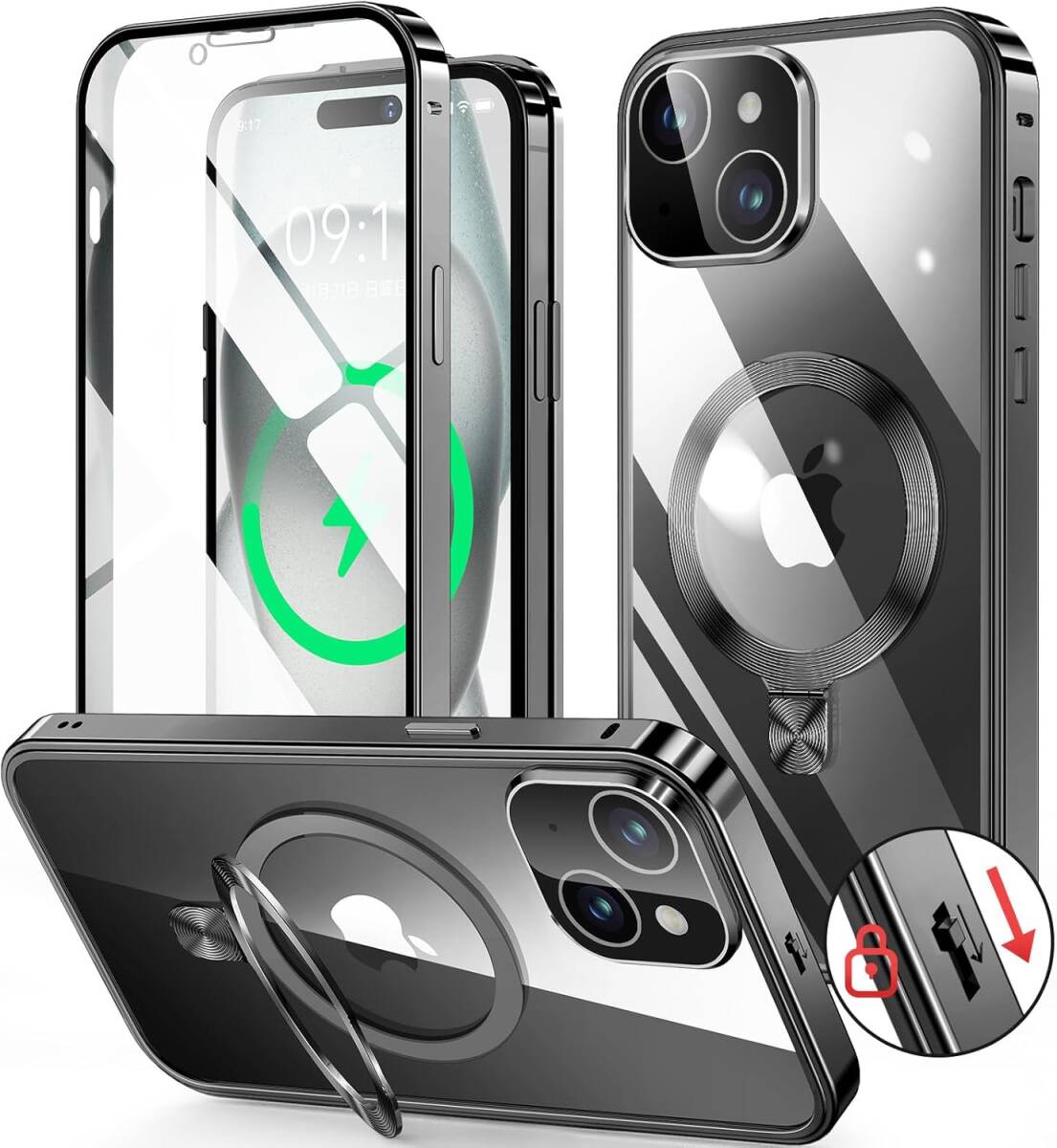 HGUTREY【スタンド機能付き・アクションボタン】 iPhone15 用 ケース クリア 【ロック付き】【CDリング・MagSafe対応】 9H強化ガラス/S656