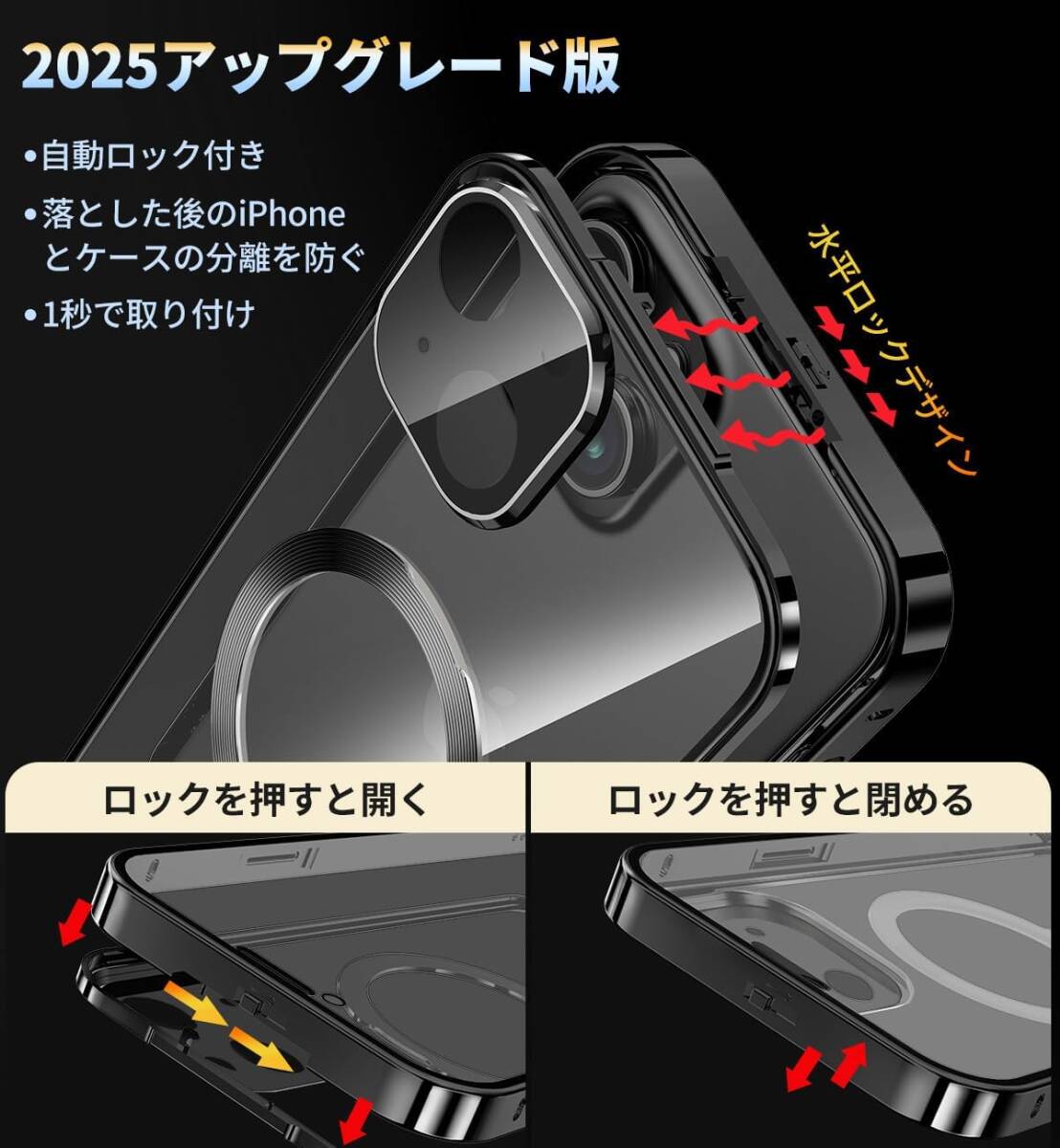 • 【ロック機能付き・アクションボタン・1秒で取り付け】革新的な技術、このアイホン15 ケースは上部にアクションボタンのロックでケースの前後パーツをしっかり固定、万が一落下してもケースが分離せず、携帯がケースから飛び出す心配ないです。上部のアクションボタンを押すだけで、ロックの解除も簡単、ケースを簡単に取り付けできるのが便利です。取り付けるとき、後カバーと前カバーの底部が位置合わせされ、ぴったりとフィットしていることを確認してください。