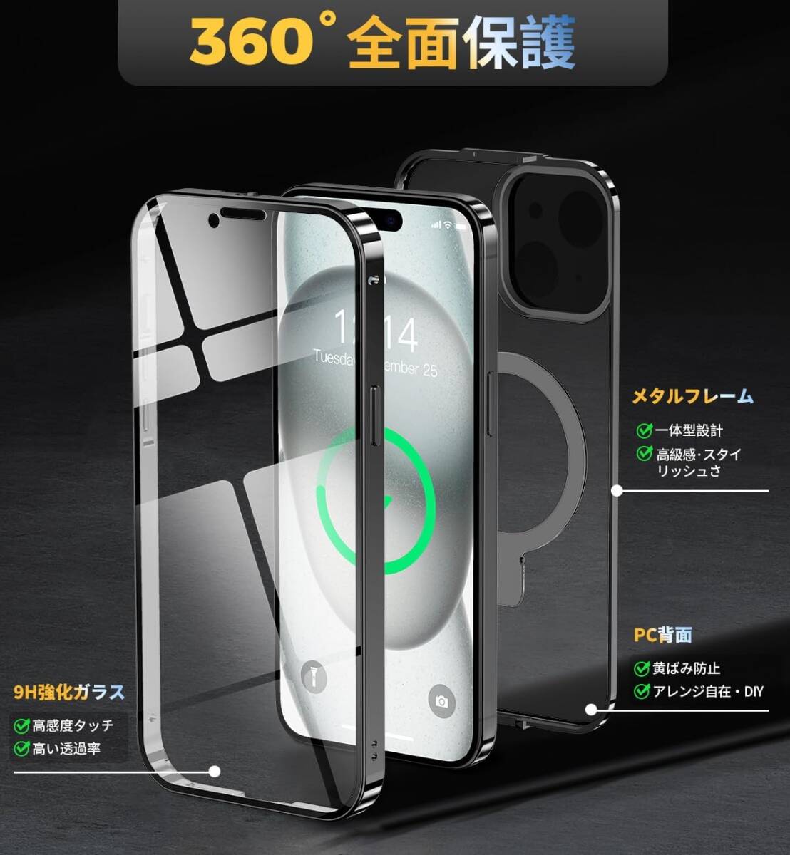• 【メタルフレーム・PC背面・ストラップホール付き】このiPhone15 ケースのフレームは高品質の航空アルミニウム合金製によって設計です。メタルフレームは高級感を演出し、弾力性と耐久性にも優れているので、長くお使いいただけます。このスマホケース iphone15は、背面の透明なPC素材を採用、ガラスとほぼ同等の透明性を持ち、非常にクリアな透明感を演出。スマートフォンの美しさを引き立てます。素材のメリットの1つは紫外線に強く、変色や劣化などに安心。ロック機能付きメタルフレームと耐震性の高透明PCパネルで組み合わせ、アイホン15を全方位からしっかりと守ります。さらに、このiPhone15 両面ケースのサイド右下にはストラップホールがあり、お好みのストラップを付けられます。落下防止対策としてもお役に立ちます。