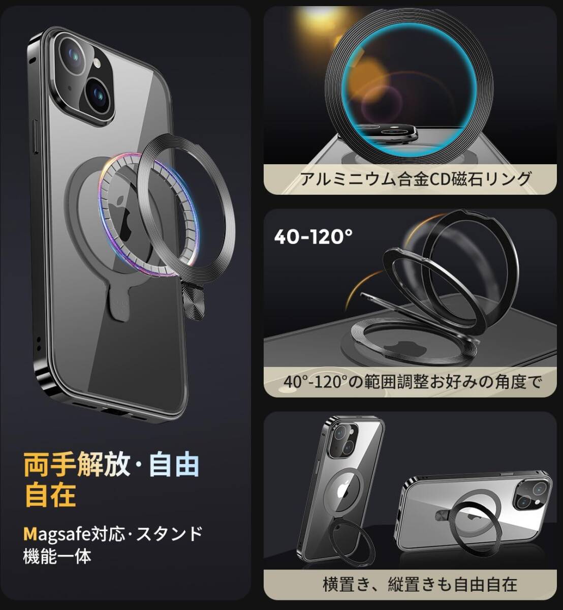 • 【全面革新!スタンド・CDリング・Magsafe対応】このあいふぉん15ケースは、動画鑑賞に便利なスタンド、CDパターンの質感の金属光沢のスマホリング、バッチリ付くMagsafe充電対応、多機能を一体化にしている、より便利で快適な暮らしを実現!このiPhone15 ケースは、高品質のアルミニウム合金CD磁石リングを搭載し、おしゃれで高級感が溢れています。3Way置き対応、縦横とも自由自在、40ー120回転可能で、最適な視野角を調節できます。これからは、映画鑑賞、オンライン授業、リモート会議、ビデオ通話などで大活躍、いつでもどこでも便利になります。同時に、手に取る時、自撮りの時にも、指をリングに通してスマホの落下防止になります。スマホスタンドとスマホリングをわざと購入する必要がなく、コスパ最高とは言えます。また、このアイフォン15ケースはすべてのMagSafe対応アクセサリーに対応しているので、快適なスマホライフを共に過ごしましょう!