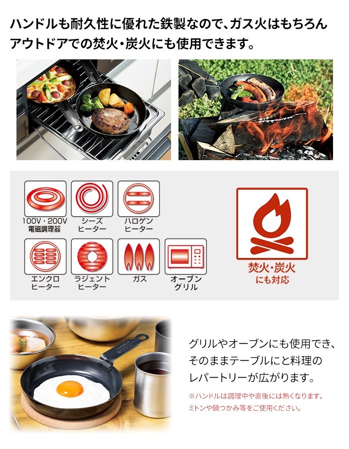 | ・IH対応 ・100V、200V電磁調理器 ・シージヒーター ・ハロゲンヒーター ・エンクロヒーター ・ラジェントヒーター ・ガス火、直火、焚火、炭火 ・オーブングリル |