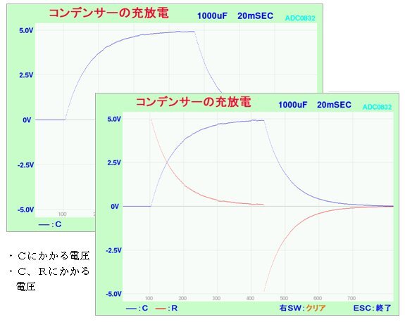●開始ボタンを押すとコンデンサーと抵抗にかかる電圧を8ビットAD変換して1ドット描きます。これを800回繰り返して1画面測定終了ですが途中で中断することもできます。測定間隔は20ミリ秒ですが少し誤差が入って16秒より少し多くなります。プログラム1行を変更して測定間隔を自由に変更できます。