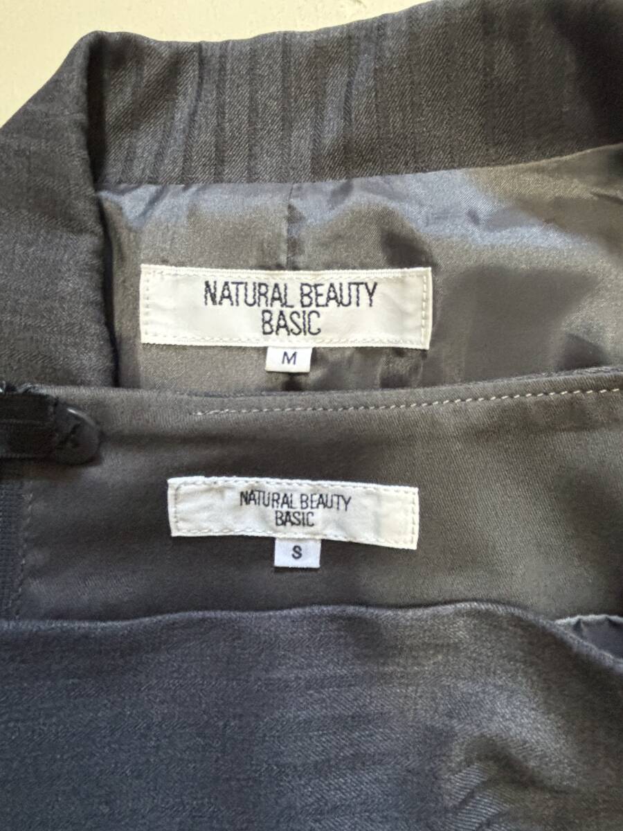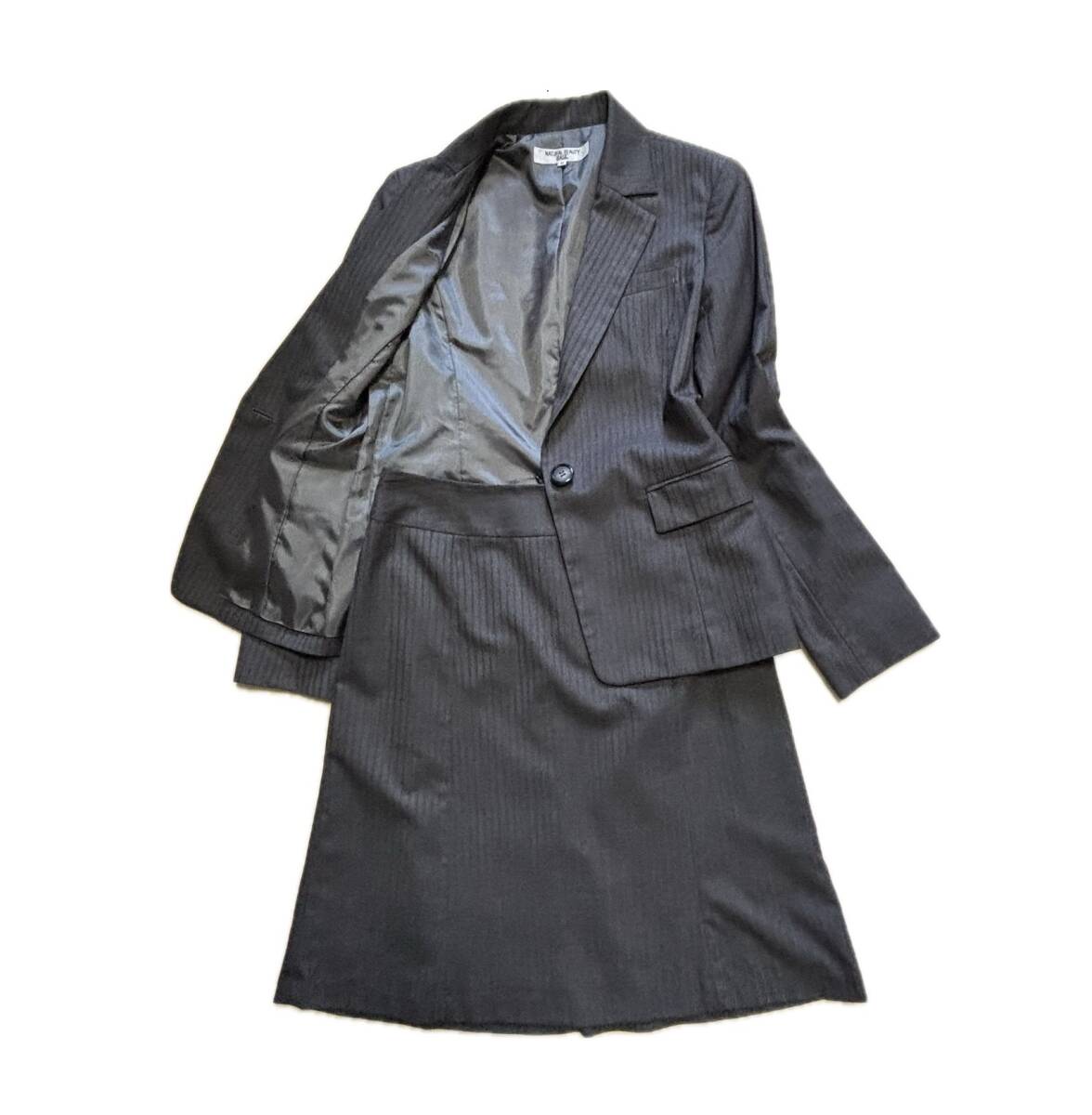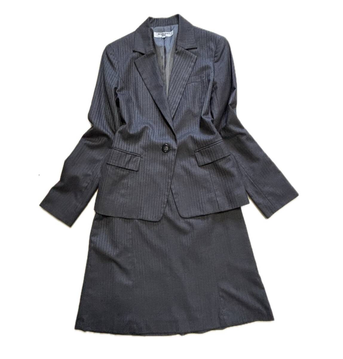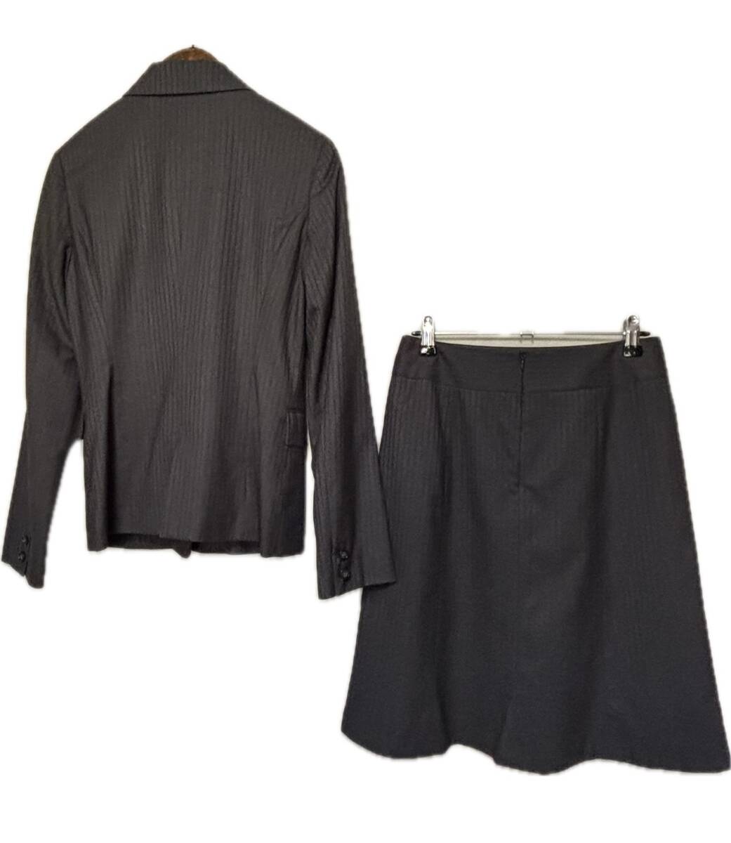 ■ 特徴:ジャケットの裏地は総裏,前のボタン一つ。スカートは後ろセンターファスナー,スリットなし。色はグレー系。真夏以外通年ご使用いただけます