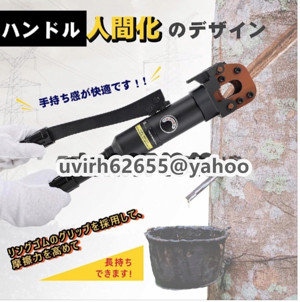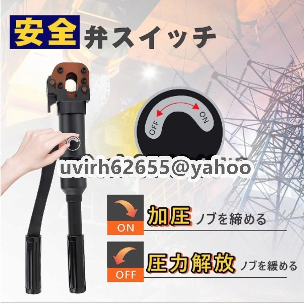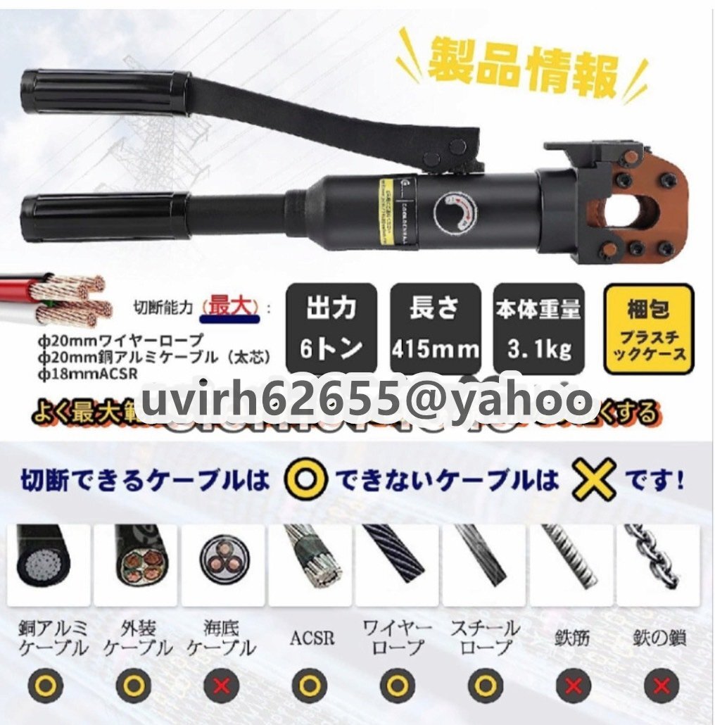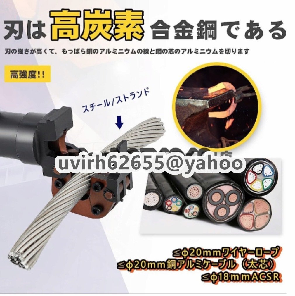 ★状態:新品未使用 ●【幅広い用途】Φ20mmワイヤーロープ, Φ20mm銅アルミケーブル Φ18mmACSRを切断可能です。 ●【切れ味抜群】高品質の合金鋼製焼き入れ刃、少しの力で鋭くケーブルを切断できます。誰でも簡単にそうさできます。 ●【安全省力】油圧駆動で誰でも簡単にご利用頂けます。 ●【握りやすいハンドル】ハンドルにゴムカバー付き、滑り止めで握りやすい。長時間操作してもてが疲れないです。