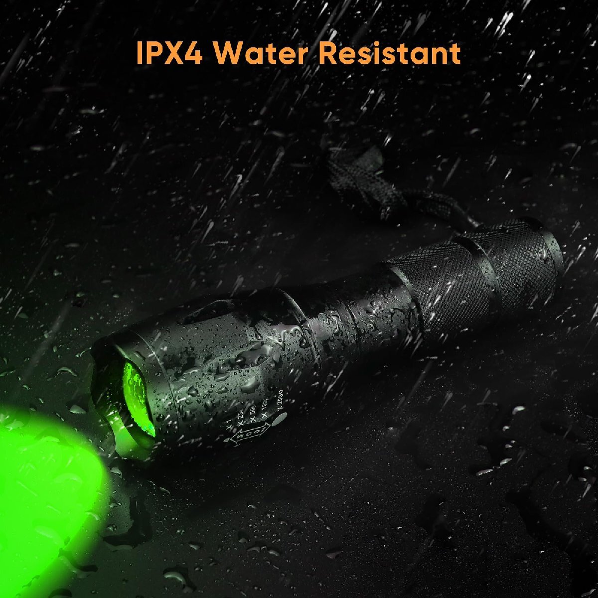 【IPX4防水耐久性】グリーンライト戦術懐中電灯は航空機級アルミニウム合金で作られ、耐震、落下防止、防水で、雨や雪などの悪天候の屋外で使用することができる。