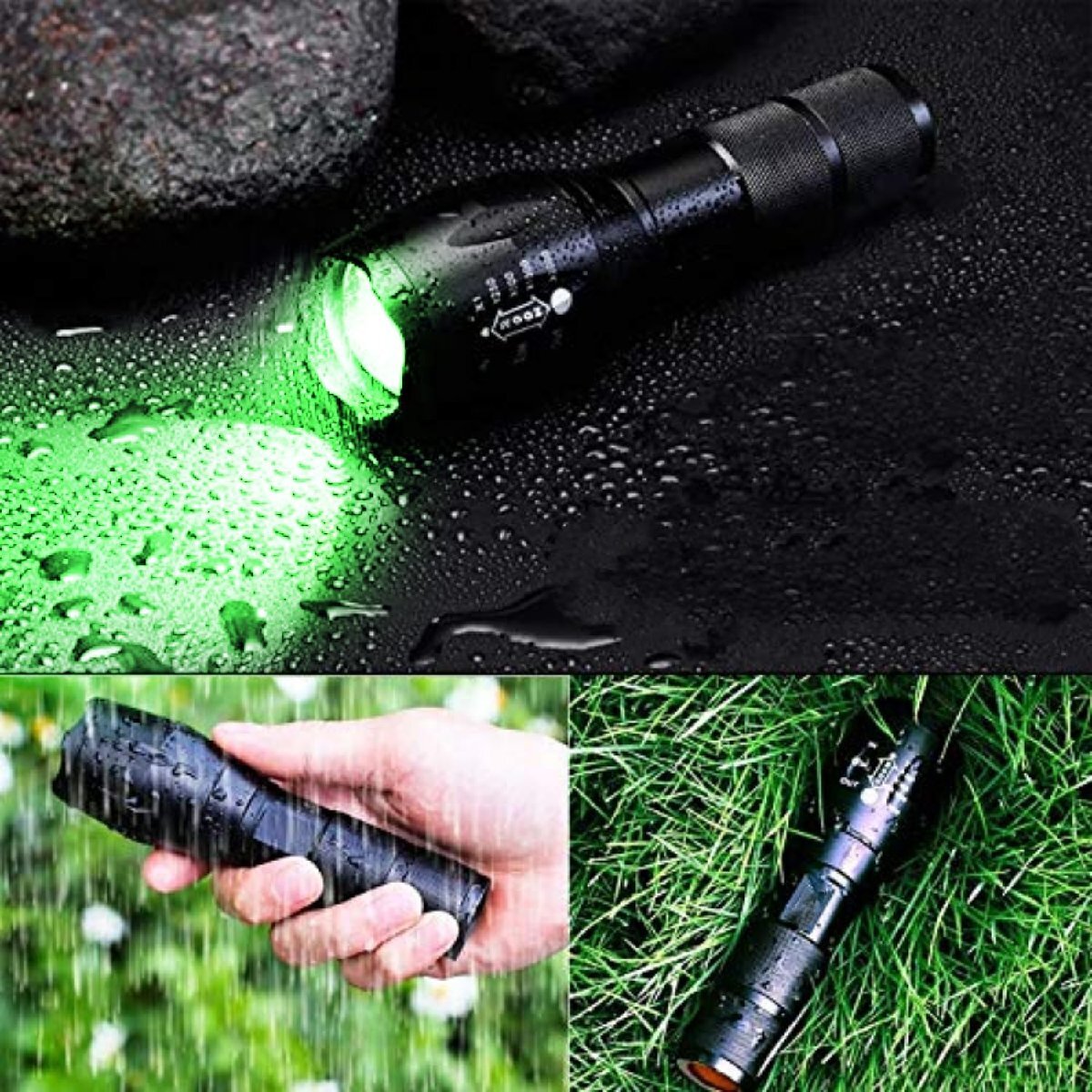 【SALE期間中】 緑光戦術懐中電灯、強力緑光フラッシュライト、1種点灯モード、ズーム調整可能ハンディライト、IPX4防水、豚狼