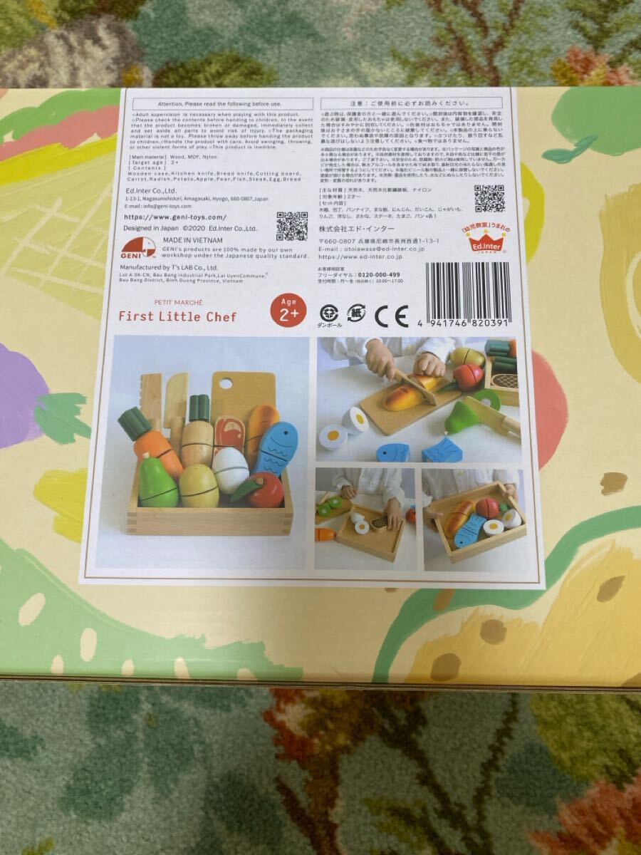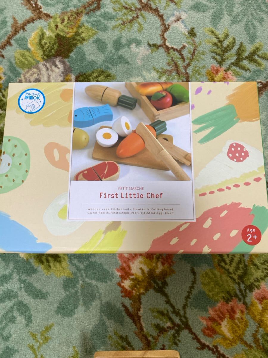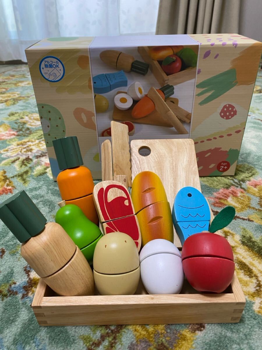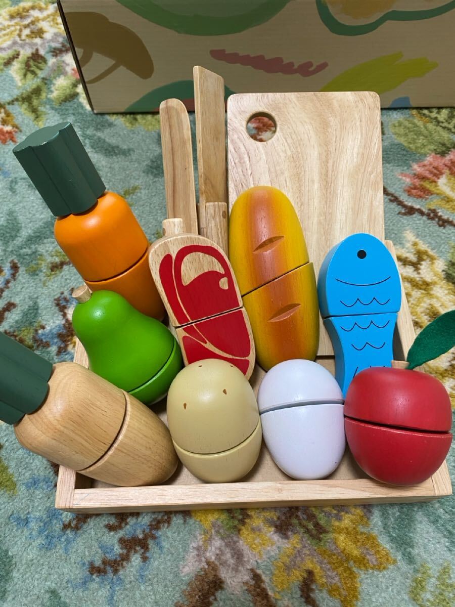 木箱、包丁、パンナイフ、まな板、さまざまな野菜や果物、卵、パン、すべて揃ってます