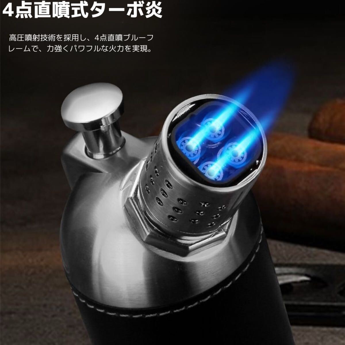 1、【四連直噴ブルーフレーム】高圧噴射技術を採用し、4つの出火口勢いよく噴射されるブルーフレームで、タバコ・シガー・BBQ・アウトドア調理など、あらゆるシーンで安定した着火を実現します。