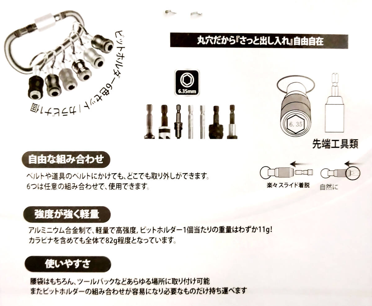 ◆ ビットホルダー カラフル 6個セット(カラビナ付き)◆ 六角軸1/4(6.35mm)対応 ◆ 送料無料 ◆
