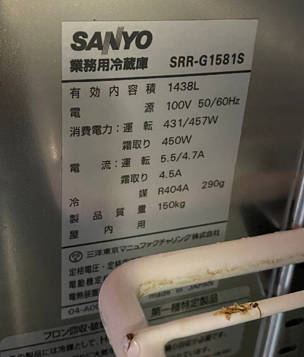 √OG√ サンヨー 業務用冷蔵庫 タテ型冷蔵庫 2009年式 中古品 SRR-G1581S W1460×D750×H1980 50/60Hz 100V 現状品 √Z-200398