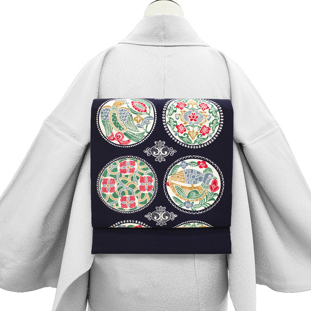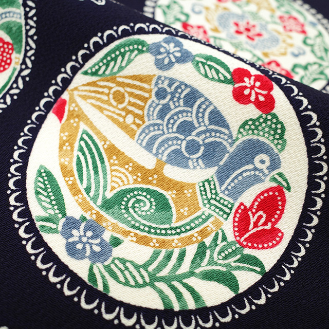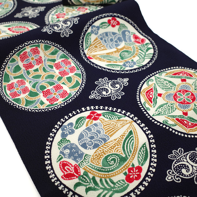 上質な縮緬生地のこちらの帯は、粋な黒紺色地に 花鳥柄の花丸文が染められています。