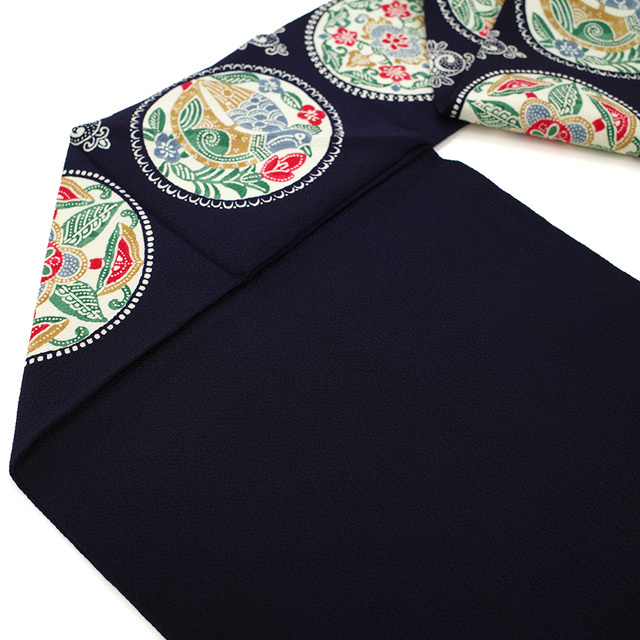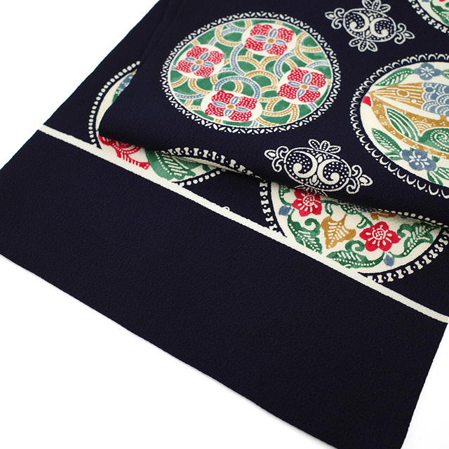 【新古品】 名古屋帯 正絹 未使用 九寸 全通 縮緬 ちりめん 型染 手染め 黒紺地 丸文 花鳥柄 全通 カジュアル 春 秋 冬 仕立て上がり みやがわ sb54244