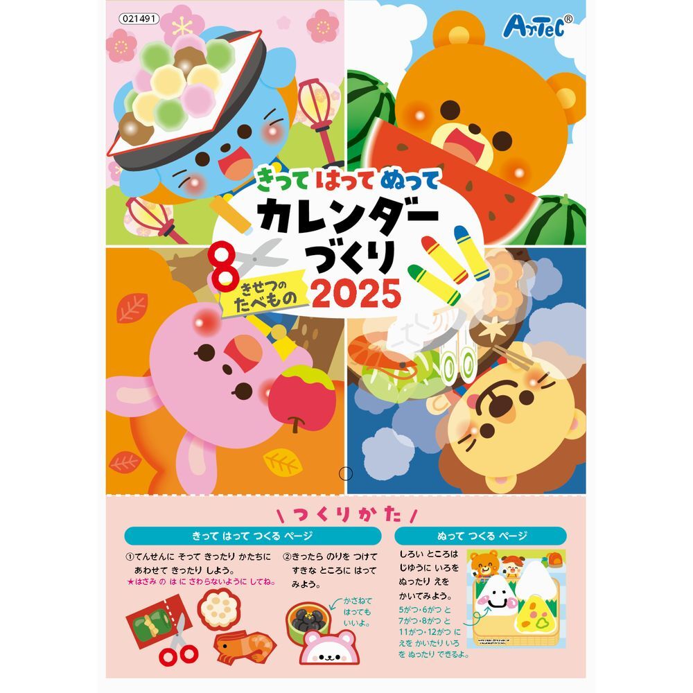 自由に切って、貼って、塗って、季節の食べ物を楽しみながらカレンダーを作るキットです。はさみ・のり付。はさみの練習にもなります。全16ページ。