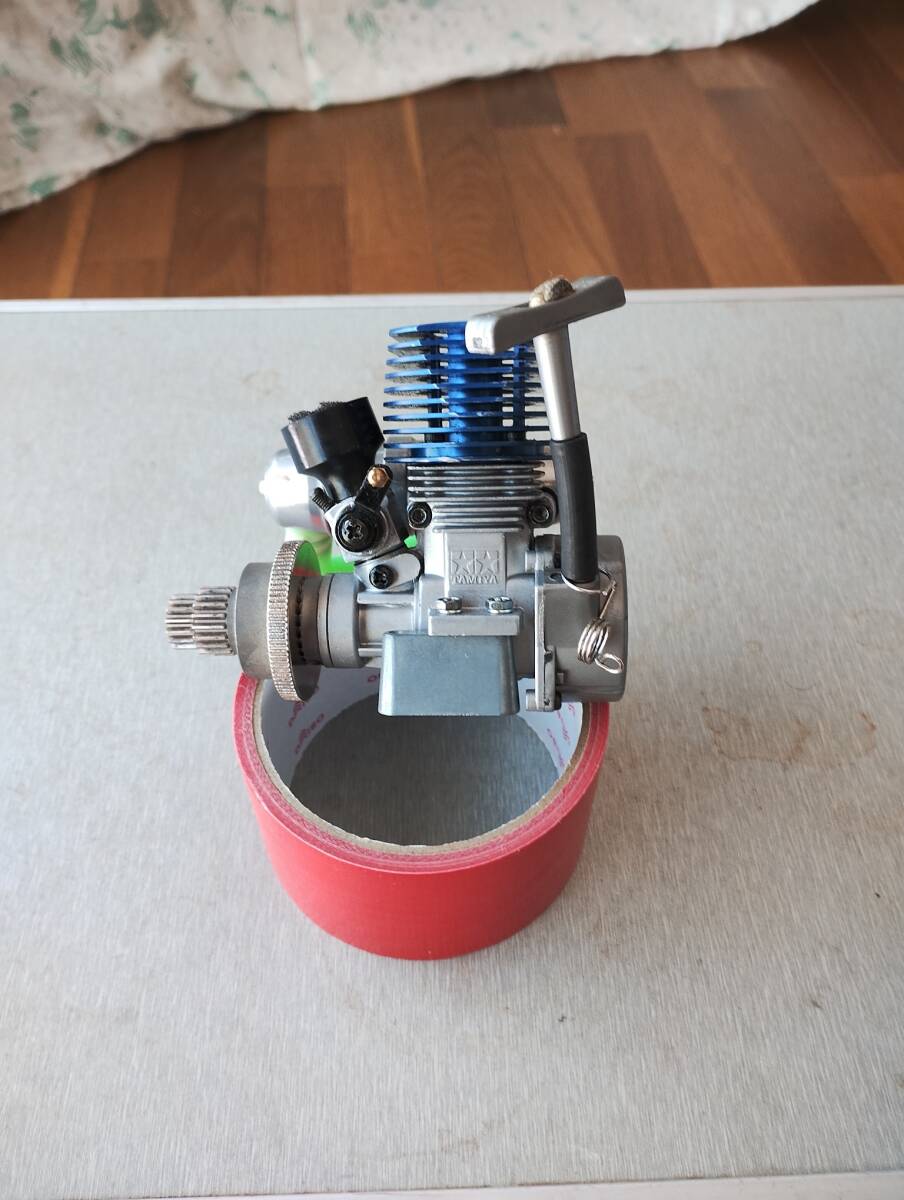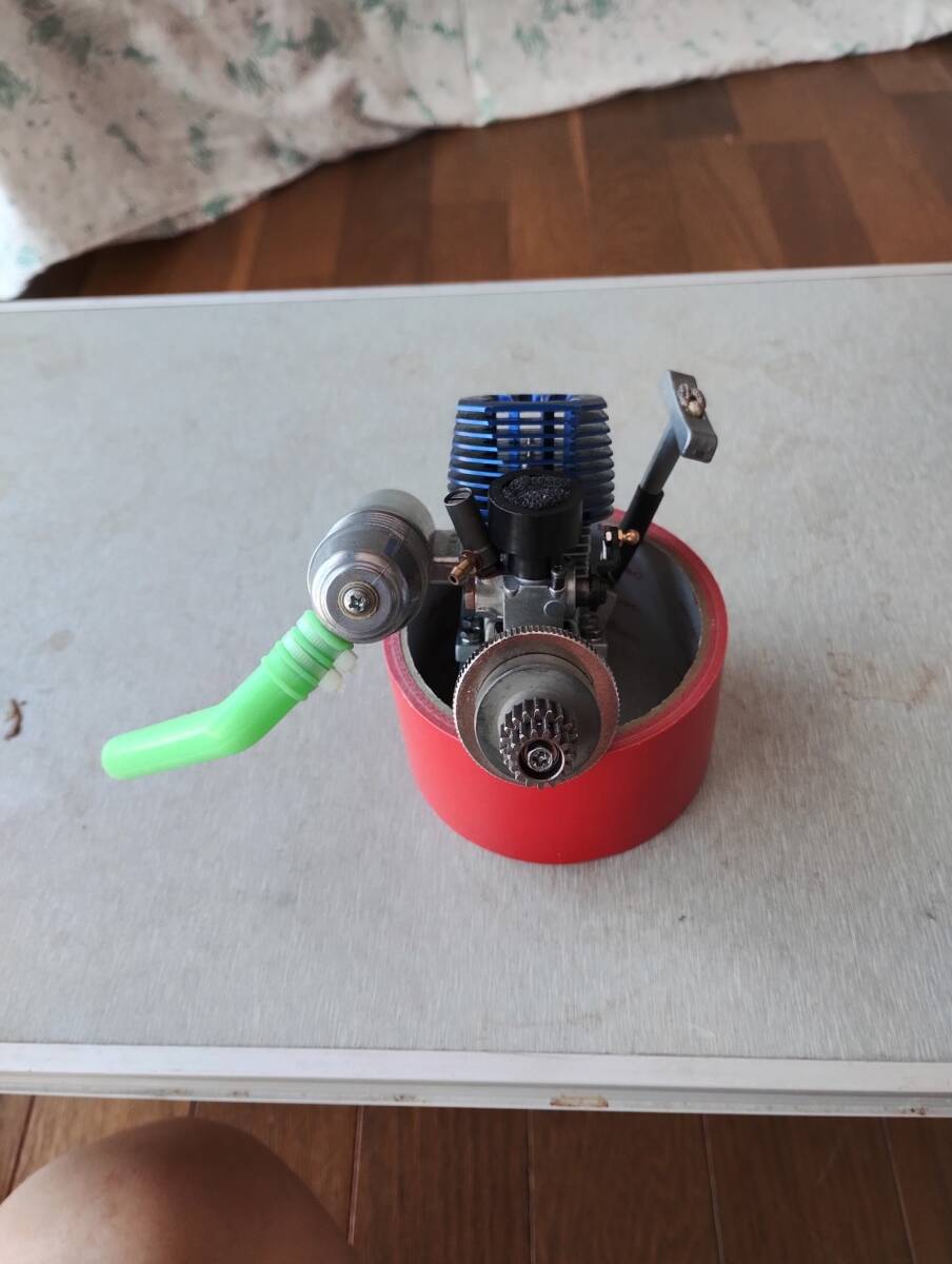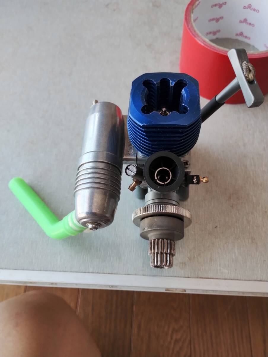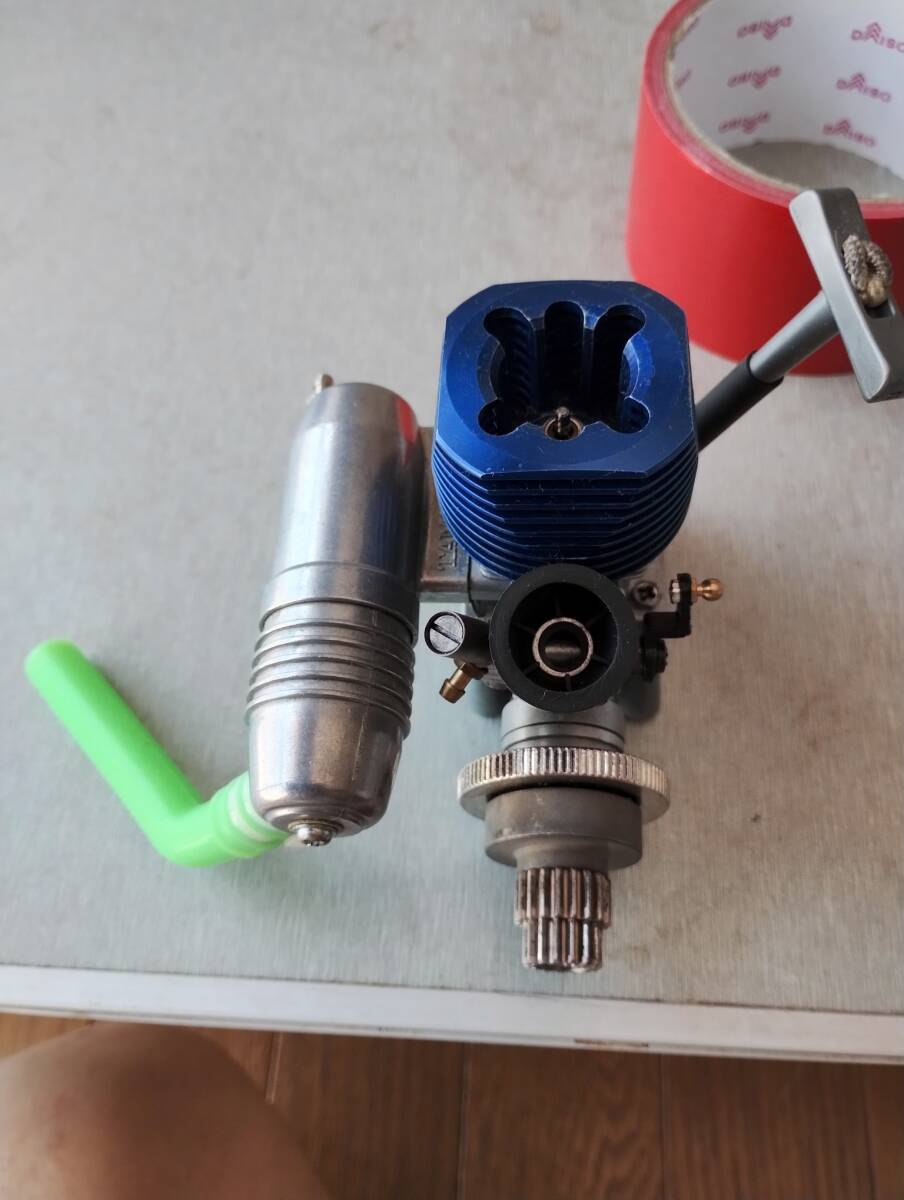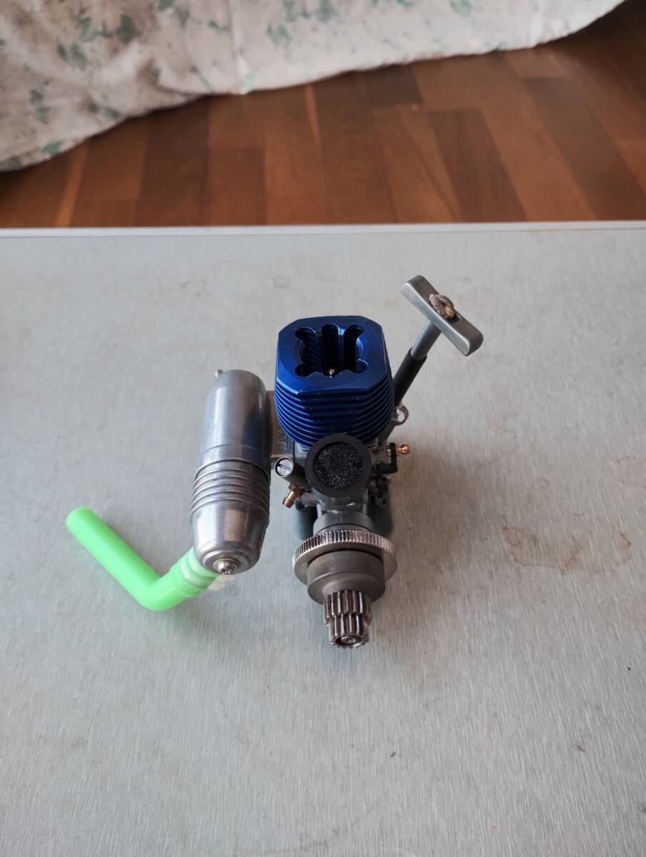 リコイルスターター装備の2ストロークエンジンFS-12、青い冷却ヘッドとマフラー付き。