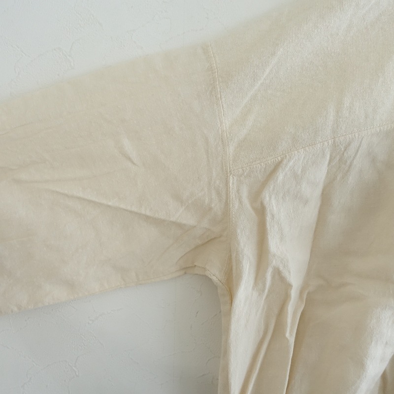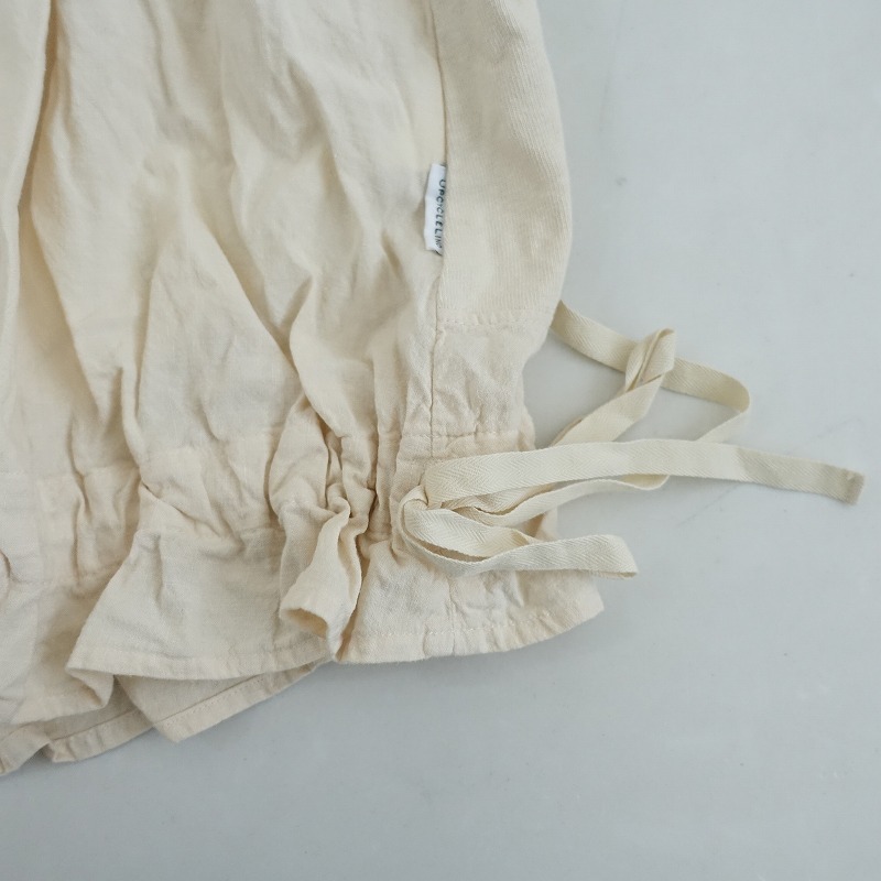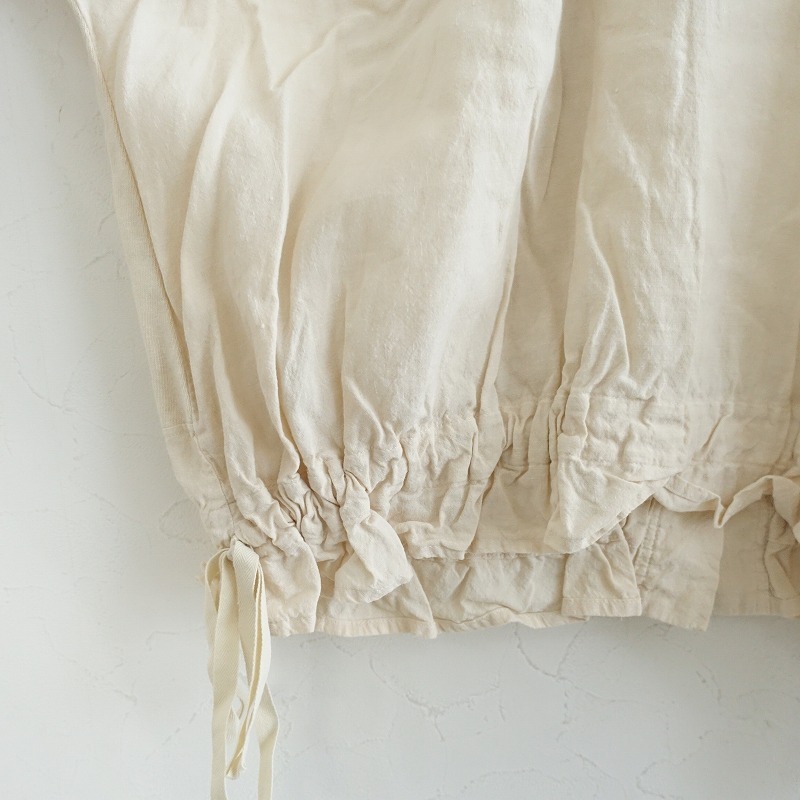 | 2025年SSコレクションnest Robe UpcycleLinoの天竺×布帛コンビ2wayトップです。カラーはライトベージュで、2種類の素材で切り替えられております。袖口はゴム入り、裾はひも入りになっており、後ろボタン開閉で着脱できます。定価(メーカー希望小売価格)24,200円 税込みの商品です。 |