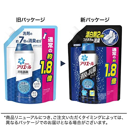 | 商品名 | アリエール 消臭&抗菌ビーズ 洗剤の7倍の消臭成分 マイルドフレッシュ 詰め替え 約1.8倍(760mL) 1袋 |