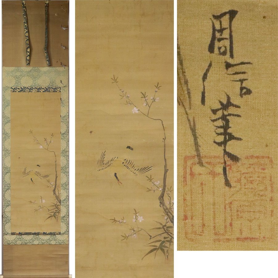 ■商品説明 下記、狩野周信の手により、 おおよそ、300年程昔に描かれた品。 美しい桃花・小禽図が描かれた作品です。 《 狩野周信(かのう ちかのぶ) 》 1660年~1728年 江戸時代前期~中期の画家。 万治3年7月2日生まれ。狩野常信の長男。 通称は右近。号は如川,泰寓斎。 延宝6年江戸城障壁画制作に参加。 正徳3年(1713)木挽町狩野家をつぐ。 享保4年法眼となり,朝鮮への贈呈屏風を手がけた。 享保13年1月6日死去。69歳。 ■絹本・肉筆 ■状 態 時代なりのヤケ・オレ及び所々虫食い跡が見られます。 ■寸 法 軸寸法/約175.0cm×約41.5cm。 本紙寸法/約 88.5cm×約31.5cm。 ■落 款 ご覧の様な銘・落款等あり。 ■箱 紙箱。 【即決・送料無料】の表示商品に限り、 一部地域(北海道・沖縄)を除き、送料無料キャンペーンを実施しております。 ご希望の方は、お早めに入札して頂けます様、宜しくお願い致します。 【※※なお、作品に対して疑問や質問がある場合には、※※】 質問欄もしくは、ストア情報に当方の情報が記載されておりますので、こちらをクリックしてお問い合わせ下さい。 宜しくお願い致します。 |