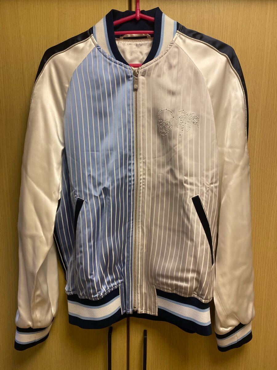 国内正規 新品未使用 lucien pellat finet ルシアン ペラフィネ バック スパンコール スカル スカル パームツリー スワロフスキー ストライプ ブルゾン ジャケット 白薄青 S