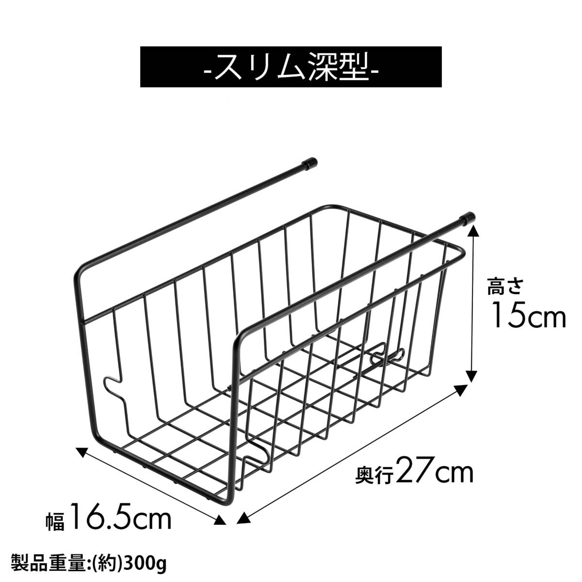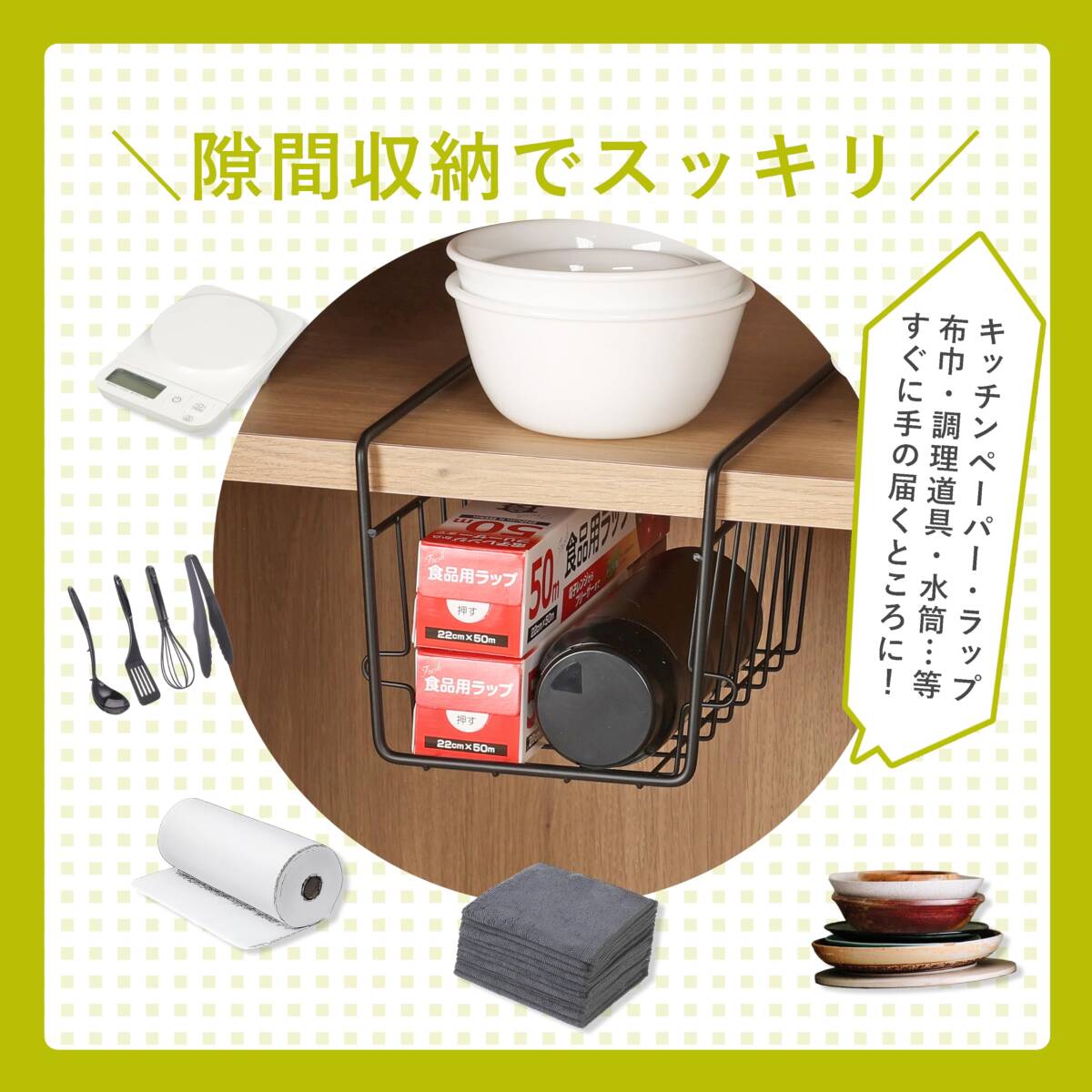 限定【BLKP.シリーズ】 BLKP. the life style in BLACK. パール金属の黒でスタイリッシュに部屋を統一。 生活感の出やすいキッチングッズから収納用品、家具までを一体感ある黒で揃えられるシリーズです。 シンプルかつ実用的なデザインで女性はもちろん、一人暮らしの男性にもおすすめ。 こだわりのスタイリングで、部屋を自分好みの空間に。 製品サイズ:(約)幅16.5×奥行27×高さ15cm 製品重量:(約)0.3kg 素材・材質:本体/鉄(エポキシ樹脂塗装)、保護キャップ/塩化ビニル 生産国:中国、耐荷重:(約)3kg ※2段まで連結OK 吊り戸棚の下を有効活用!吊り下げ戸棚の棚板に差し込むだけで簡単に取り付けられます。 よく使うキッチンペーパー・ラップ・布巾・調理道具・水筒など、すぐに手の届くところにすっきり収納できます。 お弁当箱・タッパー・キャニスター・ス・パスタなどのストック収納にも。 2段まで連結できるので、上カゴの両サイドのガイドに、下カゴのハンガー部を差し込むだけで簡単に連結できます。 《連結方法》 1.上カゴの両サイドのガイドに、下カゴのハンガー部を奥まで差し込みます。 2.下カゴが上カゴのフックにはまるようにしっかり差し込みセットします。 ご注意:耐荷重以内でご使用ください。