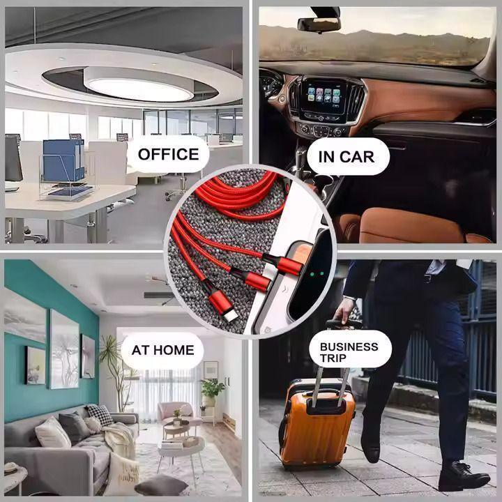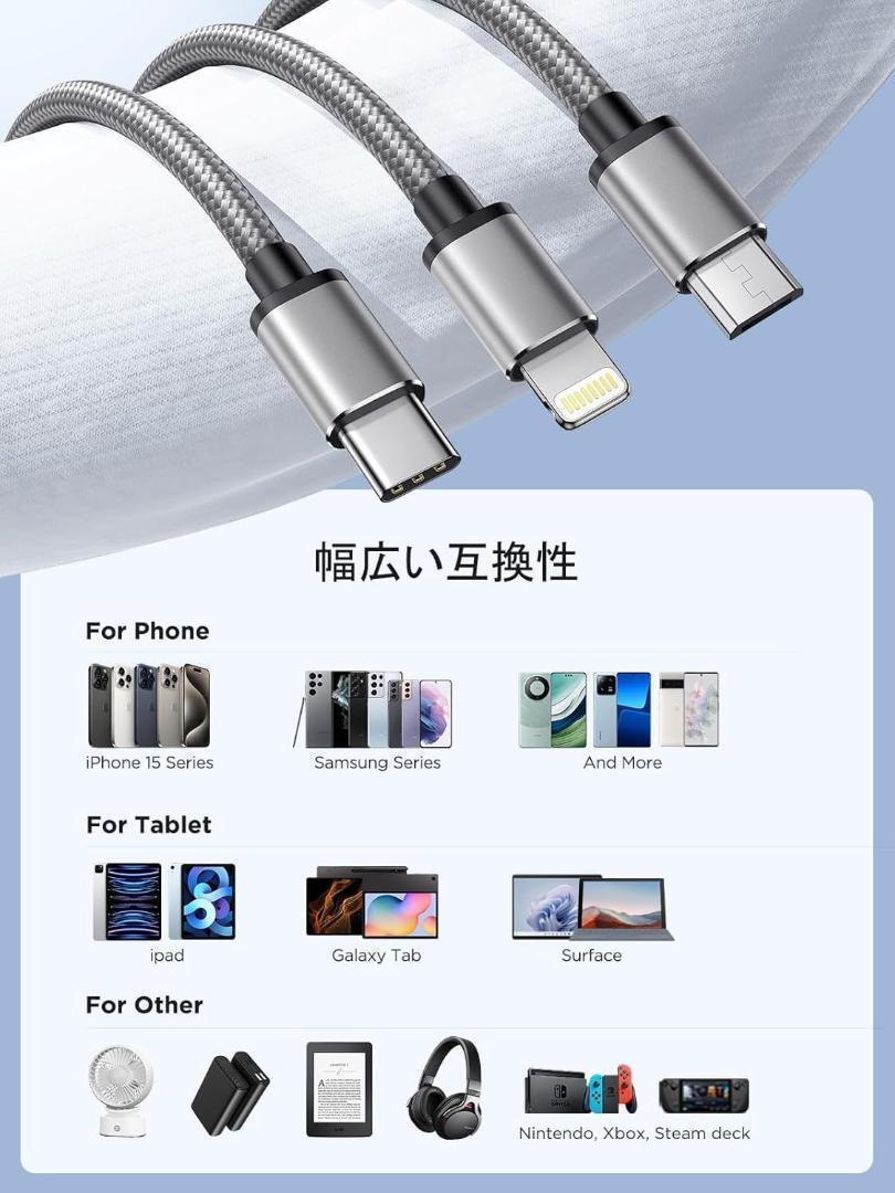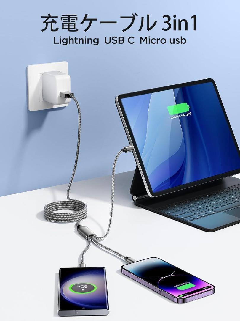このマルチ充電ケーブルは3種類の端子(Lightning・USB C・Micro usb)を搭載しており、一本で3台のデバイスを同時に充電できますので、家族や友達と一緒に使われます。