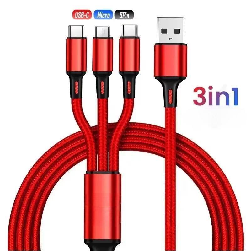 マルチ 急速充電 充電ケーブル 60W 3A 3in1 1.2m 2本 レッド色
