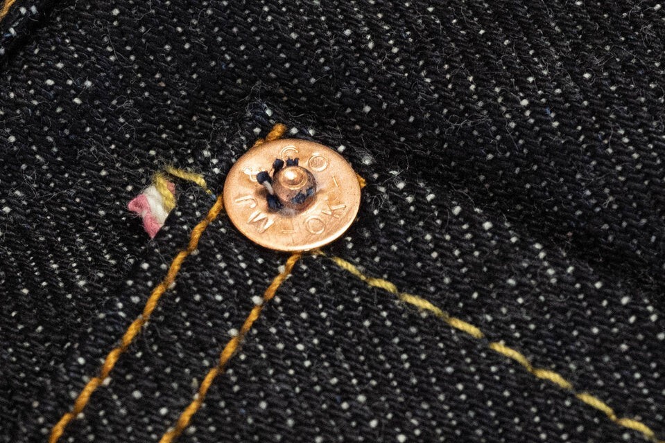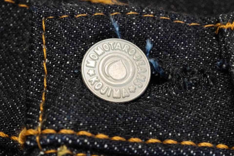 鉄製の桃ボタン、隠し銅リベット、ジャカード織りのポケット、背面の牛革パッチなど、桃太郎ならではのディテールを余すことなく採用。