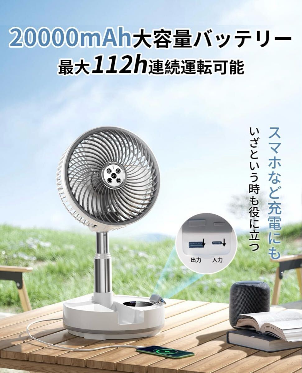 超大容量20000mAh&スマホの充電にも】1回のフル充電で約最大112時間使える大容量バッテリー内蔵されたキャンプ 扇風機。トイレやキッチンなど室内に限らず、コンセントの位置を考えずに好きな場所に設置できるので、キャンプや車中泊などアウトドアシーンでも活躍します。