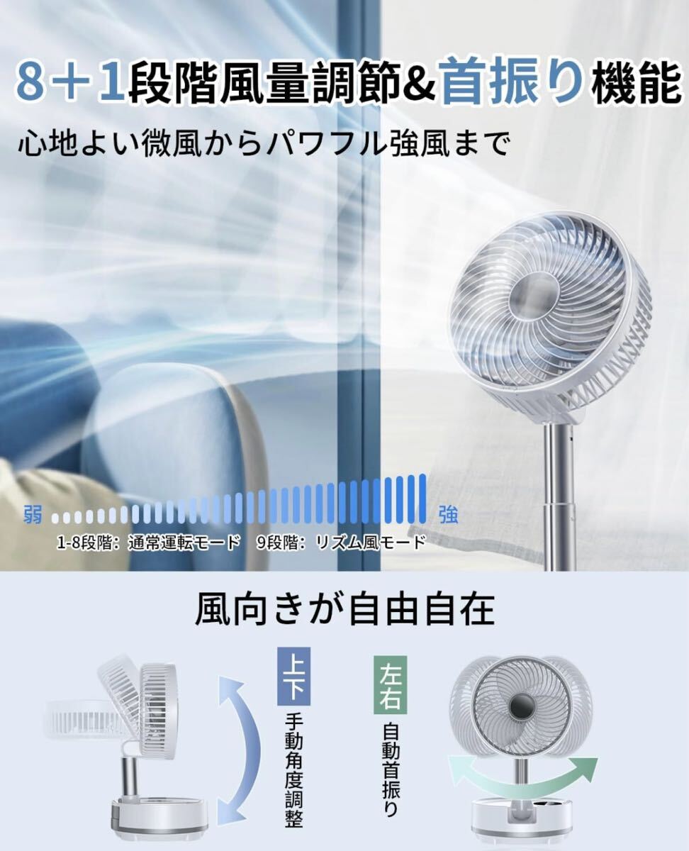 【8+1段階風量調節&自動首振り機能付】およ風のような微風から暑さを吹き飛ばす強風まで好みの風量に合わせられるよう細かく1~8段階設定でき、風量に強弱をつけ自然な風に近づけた「リズム風モード」(9段階目)も搭載され、就寝時やお昼寝の時に最適です。折り畳み扇風機は左右自動首振り二段階(90/45°)、上向きも約270°角度調節可能で真上を向けることも可能、風の範囲が広いので全身に満遍なく風が当たり。