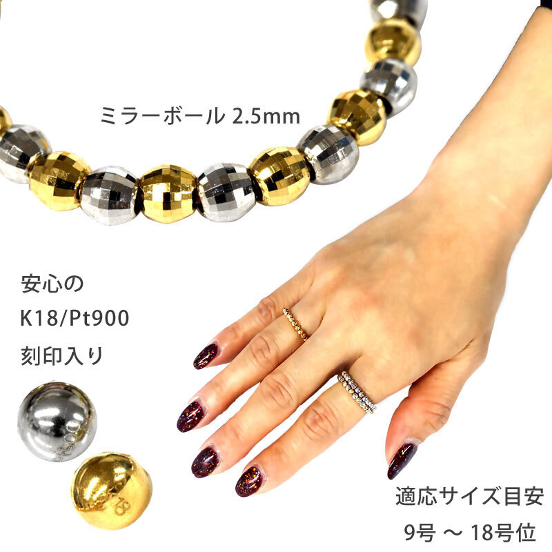 サイズ | ミラーボール幅 約 2.5 mm フリーサイズ 適応サイズ 9号 ~ 18号が目安です 重量 約 0.6 g前後 (形状記憶合金含む) |