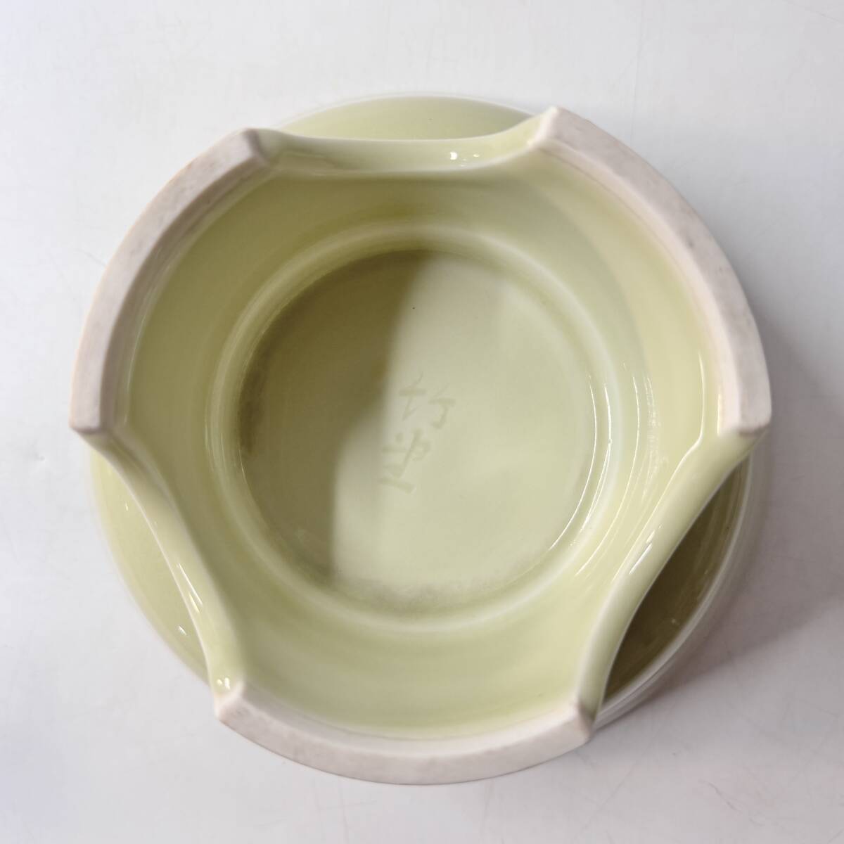 状態は趣味で華道を習われていた方のお片付けにて譲り受けたもので、経年保管品ですが、汚れ、割れ欠け、ヒビなどの特筆するダメージは見られず良い状態かと思いますが、見込みに剣山の錆によるシミが見られます。