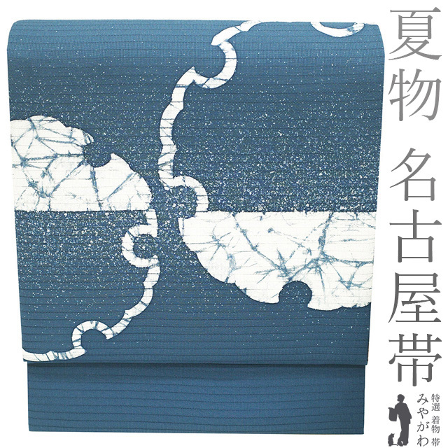 夏物 名古屋帯 未使用 正絹 絽 九寸 染め帯 染帯 手染め マリンブルー 濃舛花色 雪輪 夏 カジュアル 新古品 仕立て上がり みやがわ sb54397