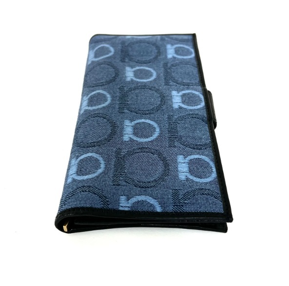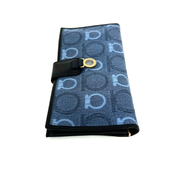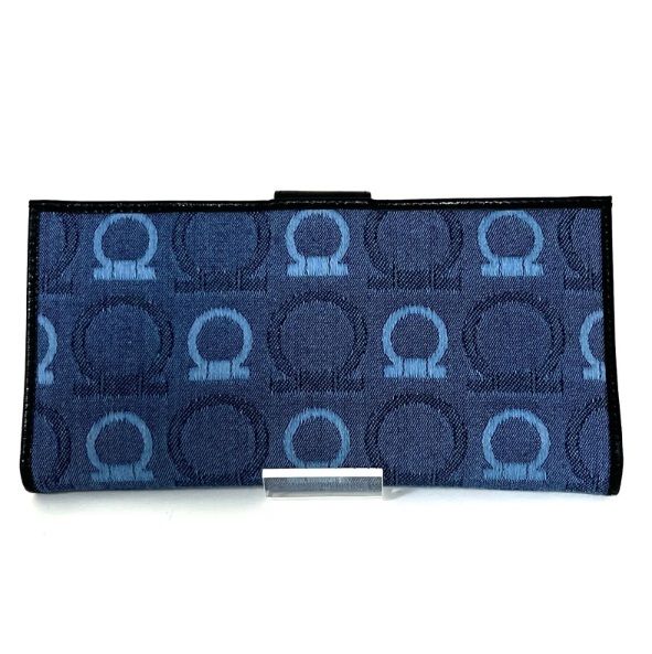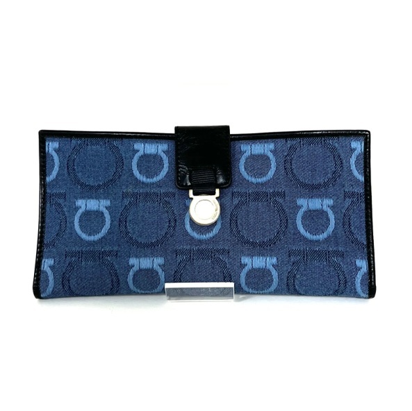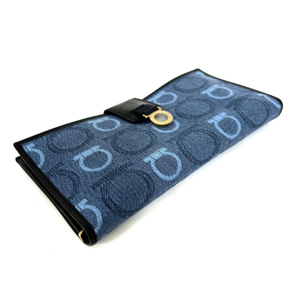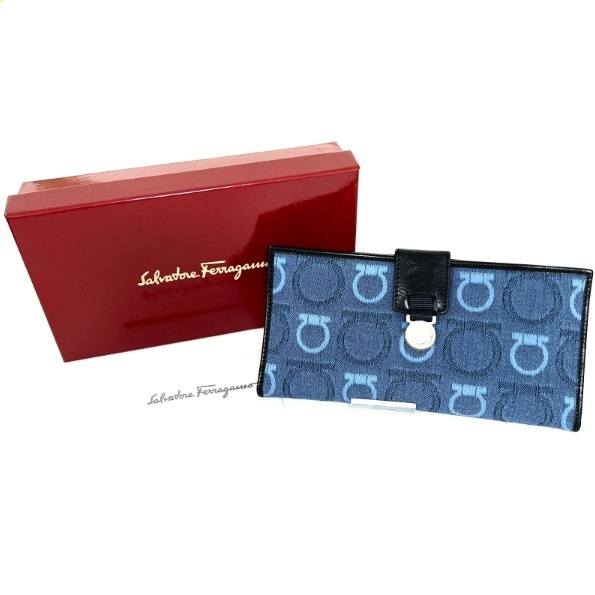 SD1900 新品未使用! Ferragamo フェラガモ ガンチーニ 二つ折り財布 ロングウォレット キャンバス×レザー ブルー×ブラック ゴールド金具