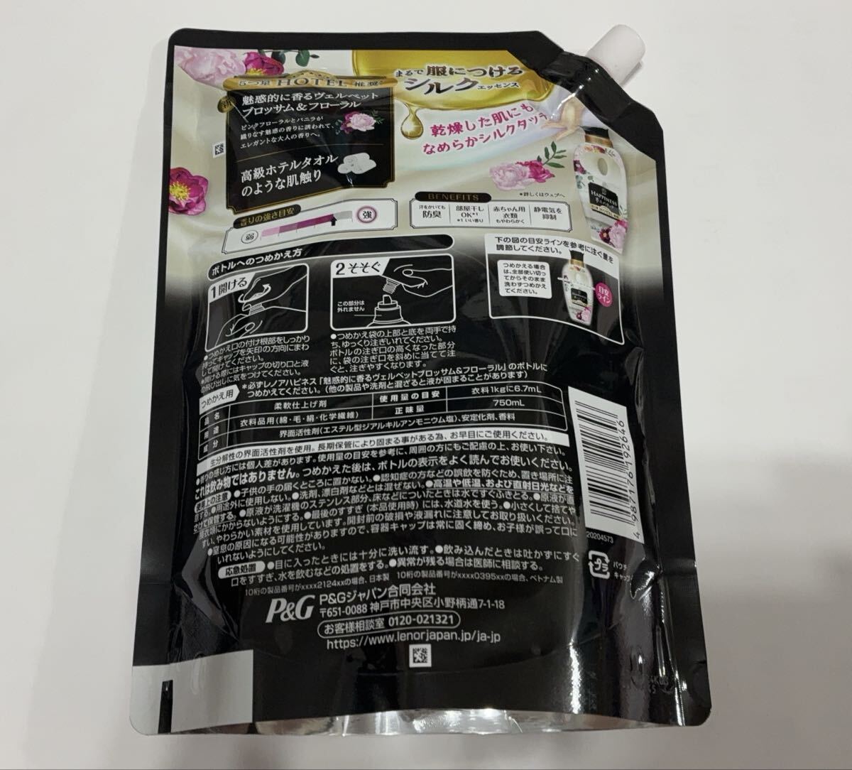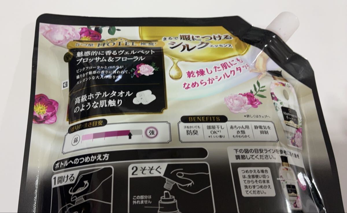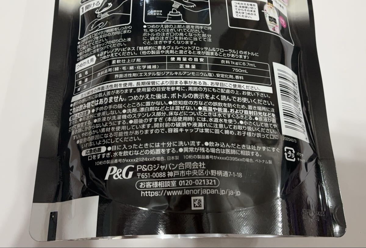 ●成分:界面活性剤(エステル型ジアルキルアンモニウム塩)、安定化剤、香料