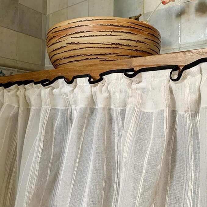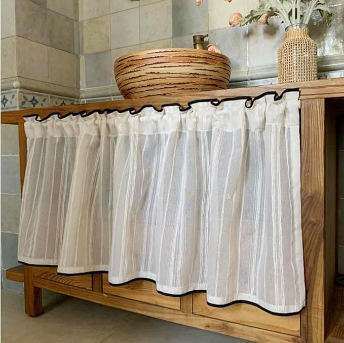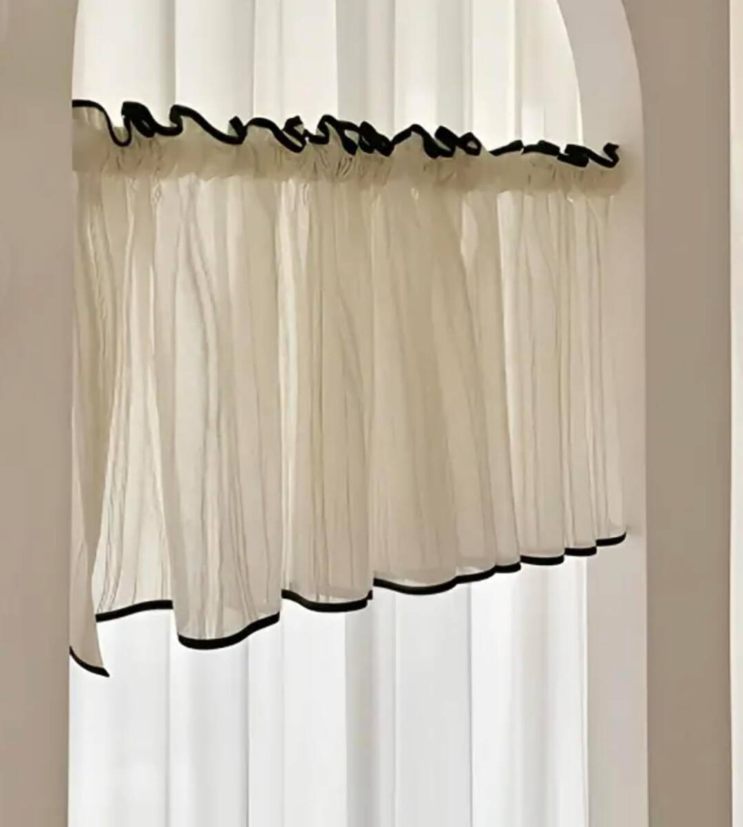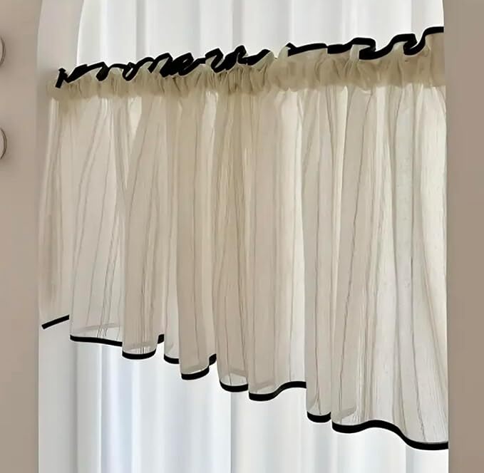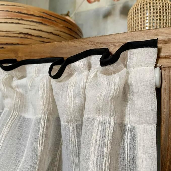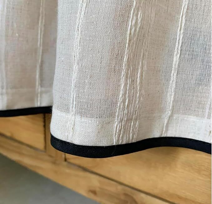 縁取りの黒いテープがお洒落なカフェカーテン。