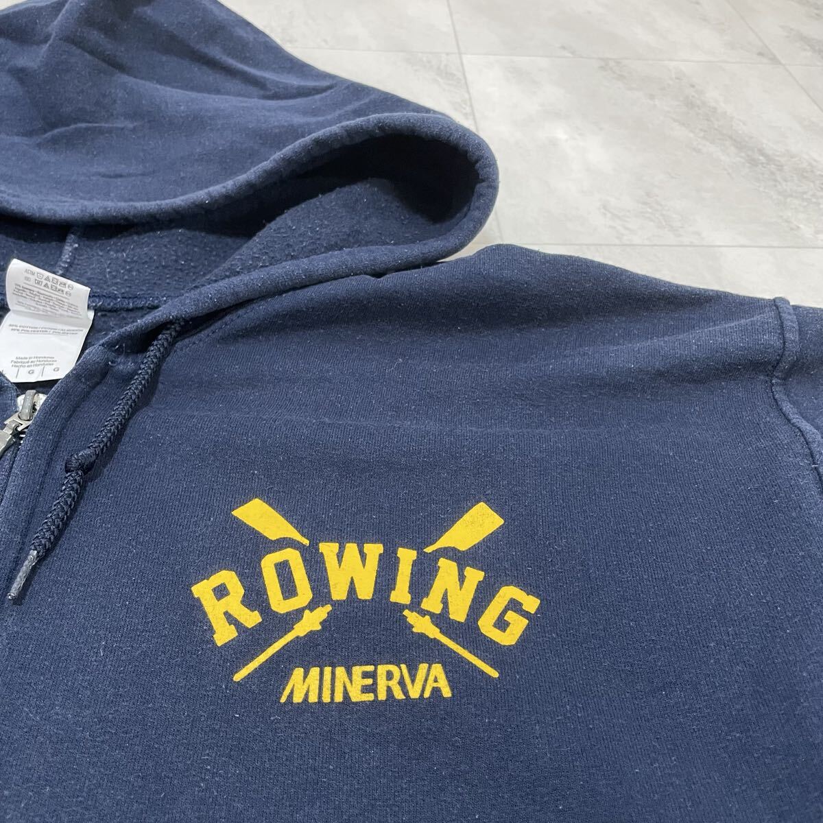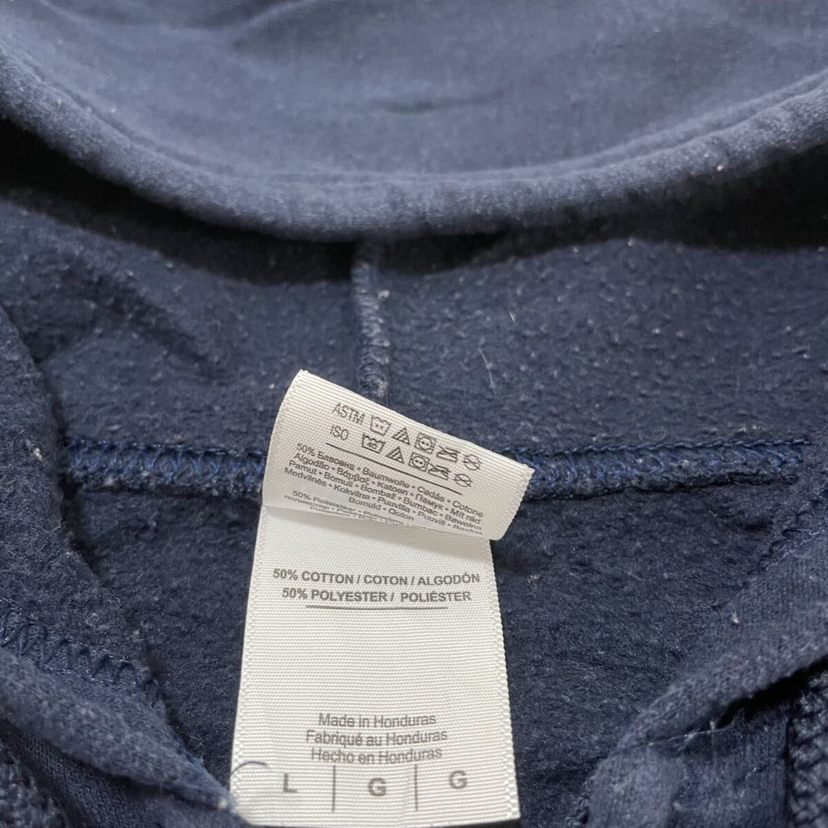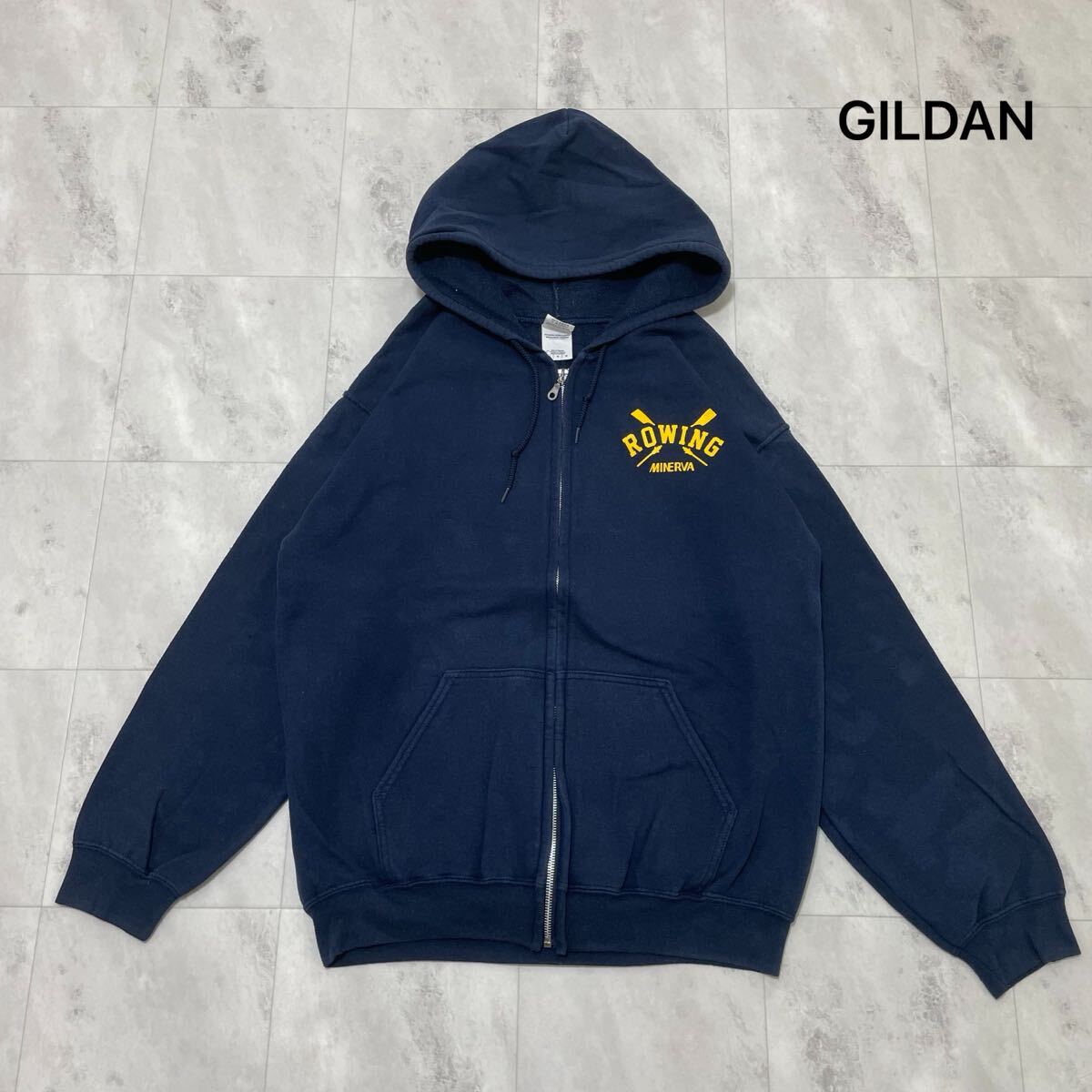 GILDAN ギルダン sweat スウェット パーカー hoodie 長袖 ヴィンテージ プリントロゴ フルジップ USA企画 アメカジ カレッジロゴ ネイビー サイズL 玉ss4237