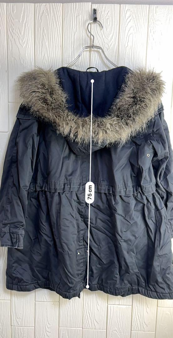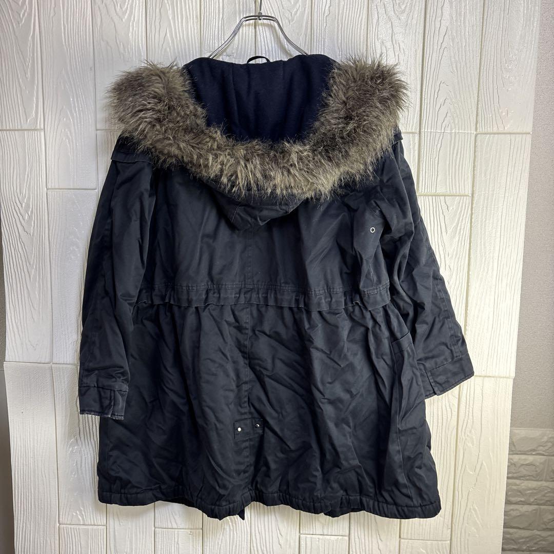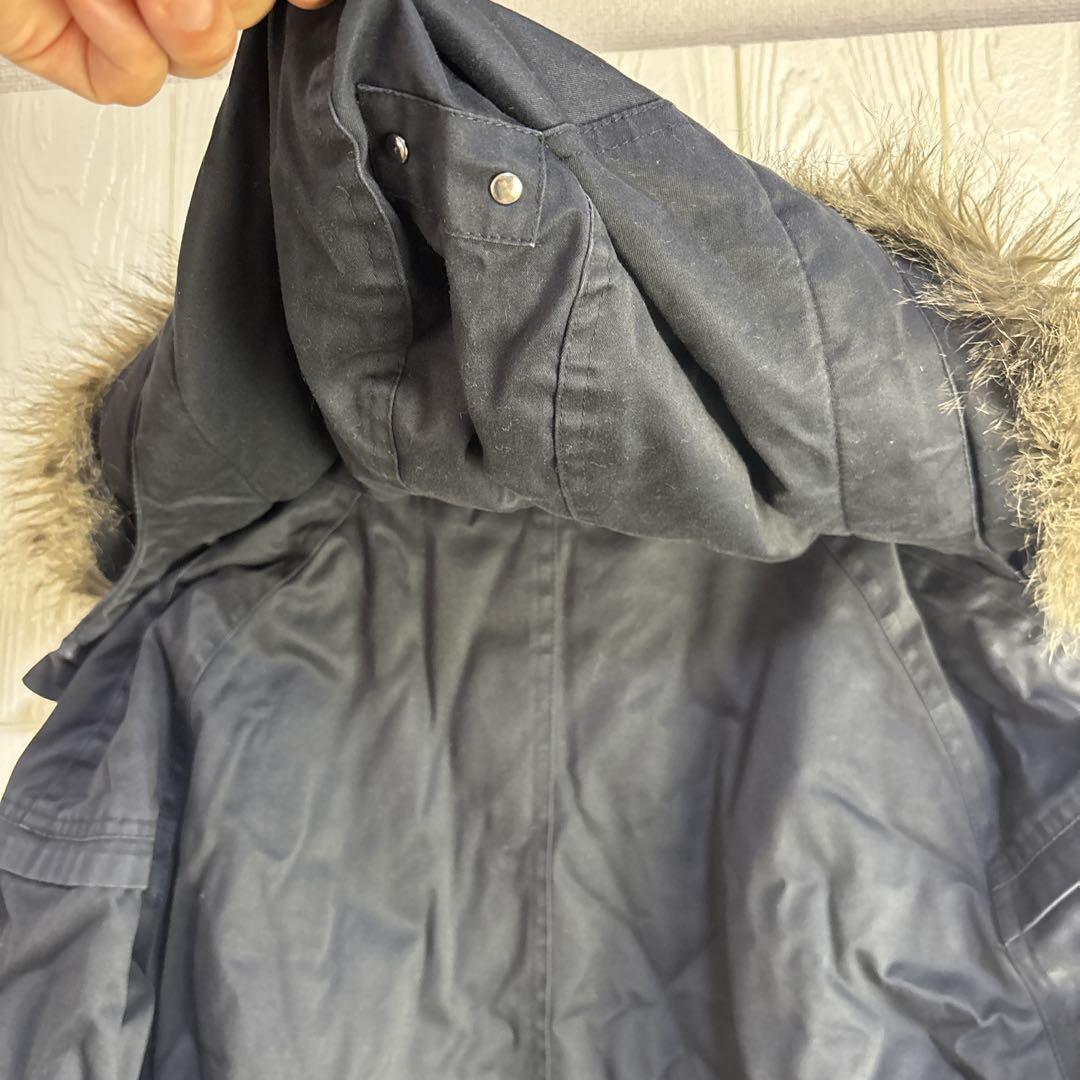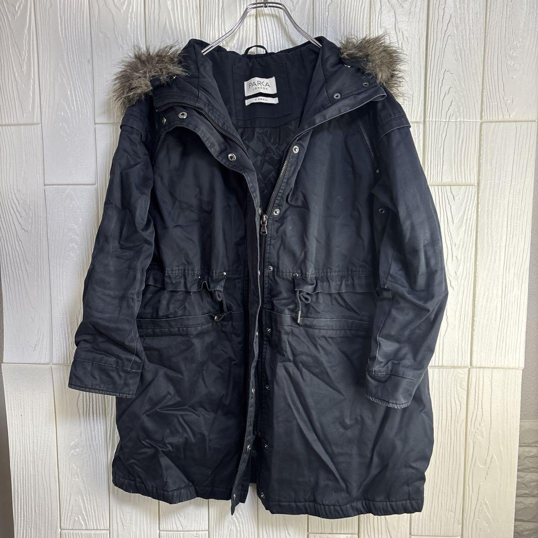 ネイビーのParka London製モッズコート、ファー付きフードとウエスト調整機能付き。