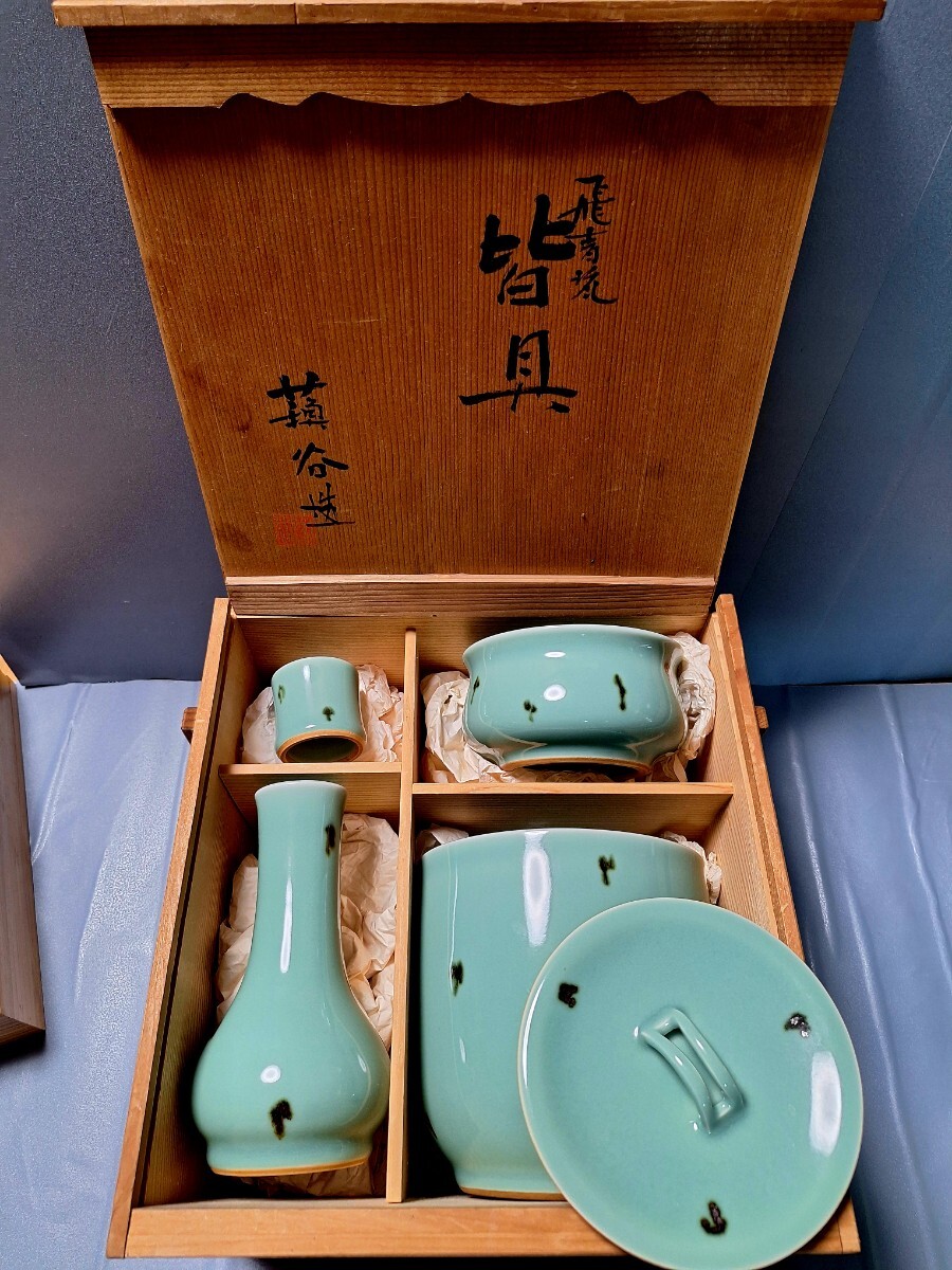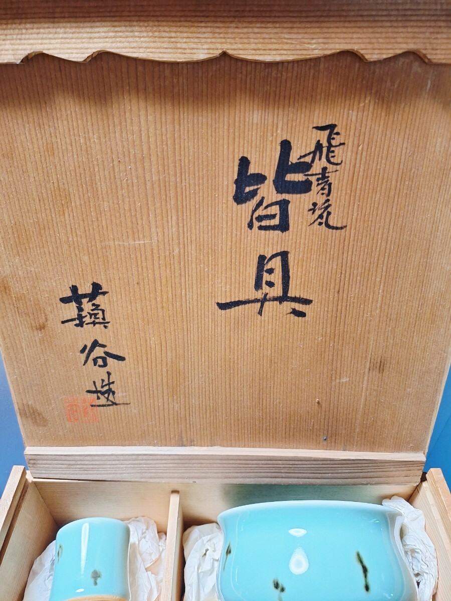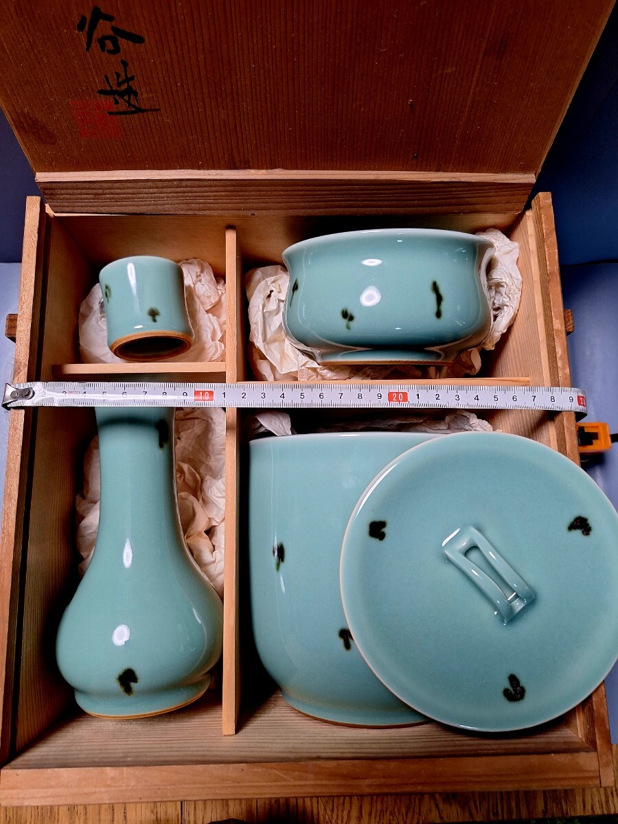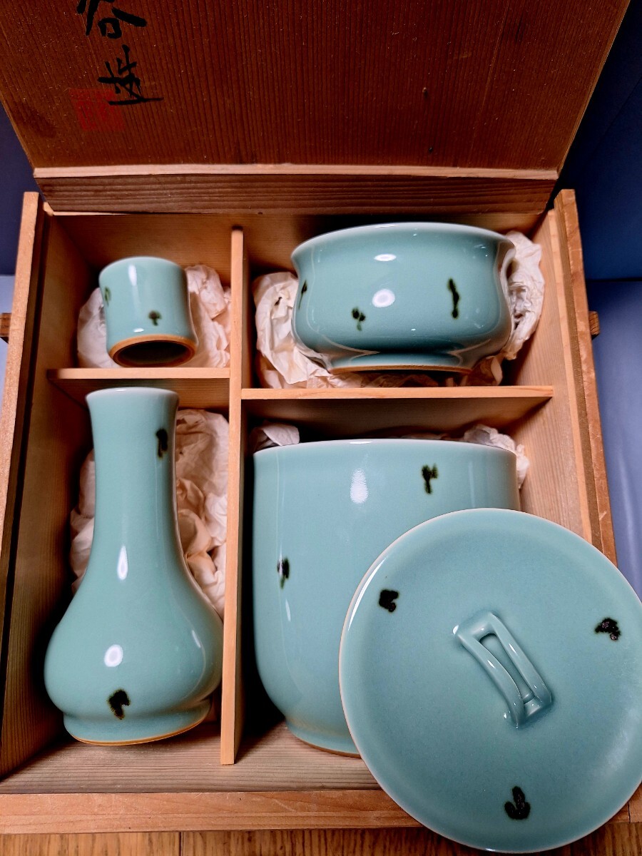 茶道 茶道具 皆具セット 飛青磁 皆具 共箱 水差 蓋置 建水 水指 裏千家 利休 煎茶道 煎茶道具 木箱入り 骨董品 陶芸品 *茶道 裏千家の教授だった祖母のコレクションです。全てが紙にくるまれて大切に保管されておりました。素人目には未使用と思われますが当方に専門的な知識がないので未使用に近いと表現しております。落札後の返品は御断り致します。