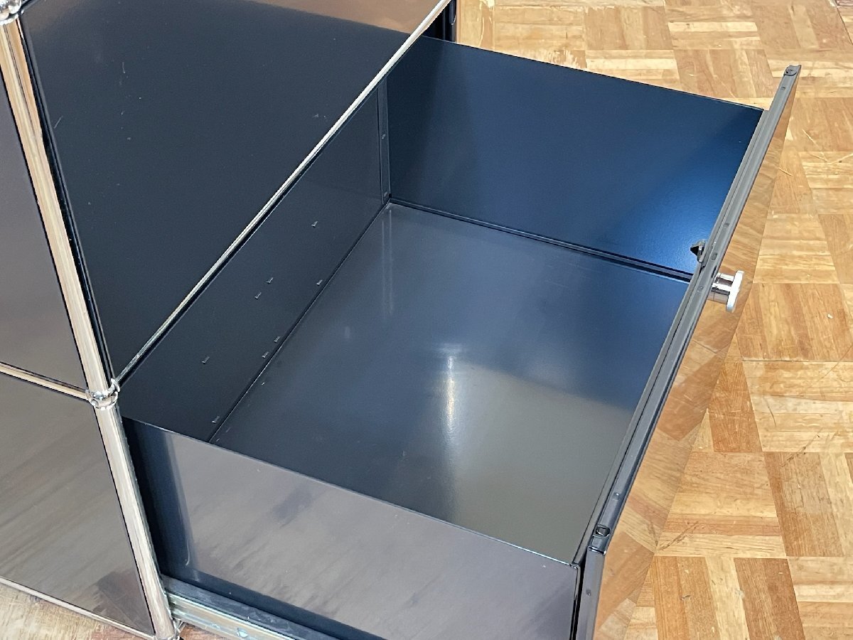 「USM Modules / USMモジュール」として知られる主用部材の組み合わせでリリースする、クロムメッキの美しい輝きと直線の面とポールの丸みを具有した端正なミニマリズムデザインで世界中のクリエイターから愛されるスイス・USM Haller の名品キャビネットミドルボード。ドロップダウンドア2連 / ドロワー2杯のハイエンド仕様品のご提案。