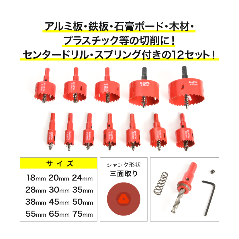 広範囲のサイズをカバーする12セット! センタードリルで穴あけ位置を固定します。 【ヘッド直径】 18mm 20mm 24mm 28mm 30mm 35mm 38mm 45mm 50mm 55mm 65mm 75mm 【確認事項】 切削精度のアップ・工具破損の低減のために切削油の併用をお勧めします インパクトドライバーで使用する場合はドリルチャックを取り付けて下さい 顔などに保護具をつけてご使用下さい。 本商品を使用してのケガ等の責任は一切負えません。 |