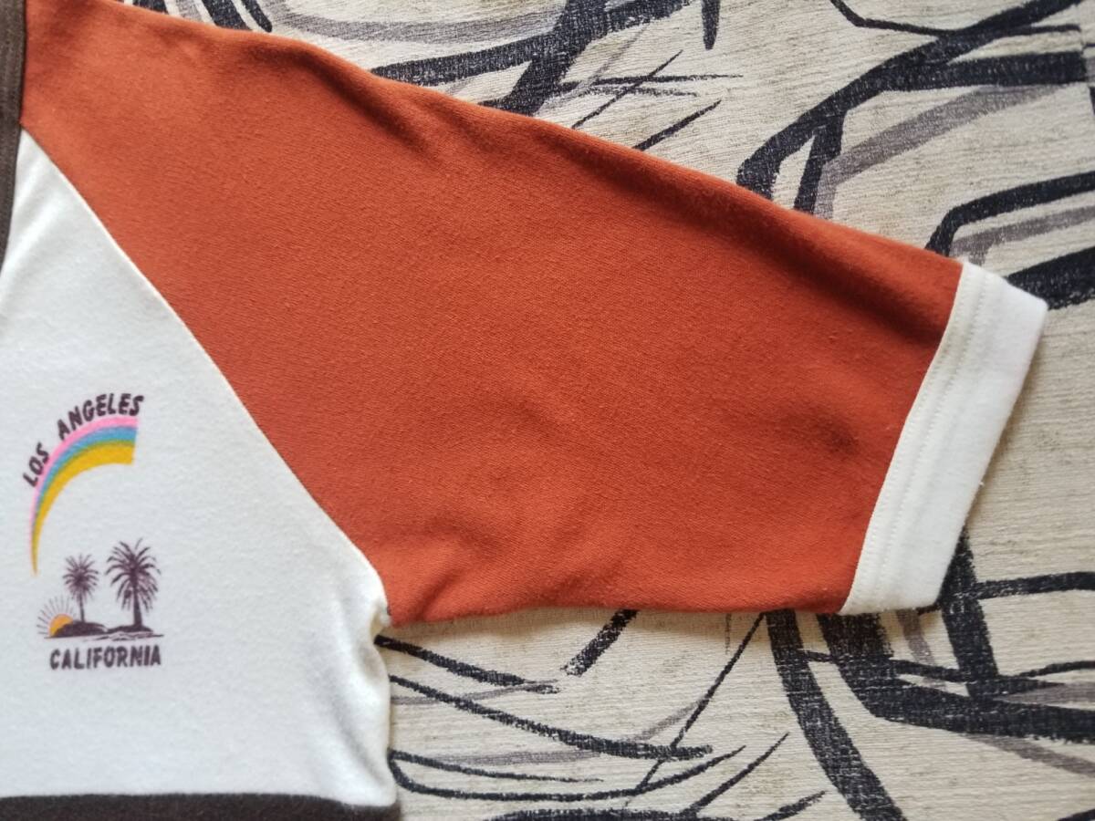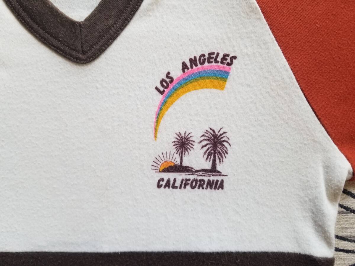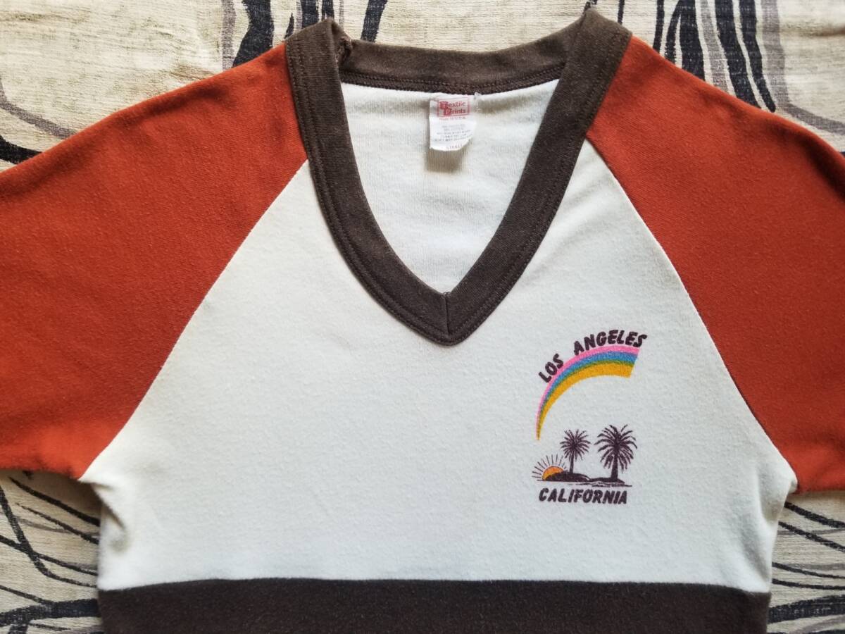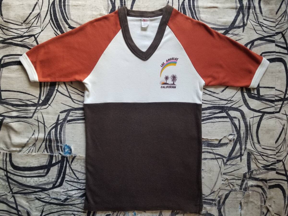 USA製 当時物 70s 80s Textile ビンテージ オリジナル レア マルチカラー 染み込み プリント Vネック Tシャツ レディース S オールドサーフ