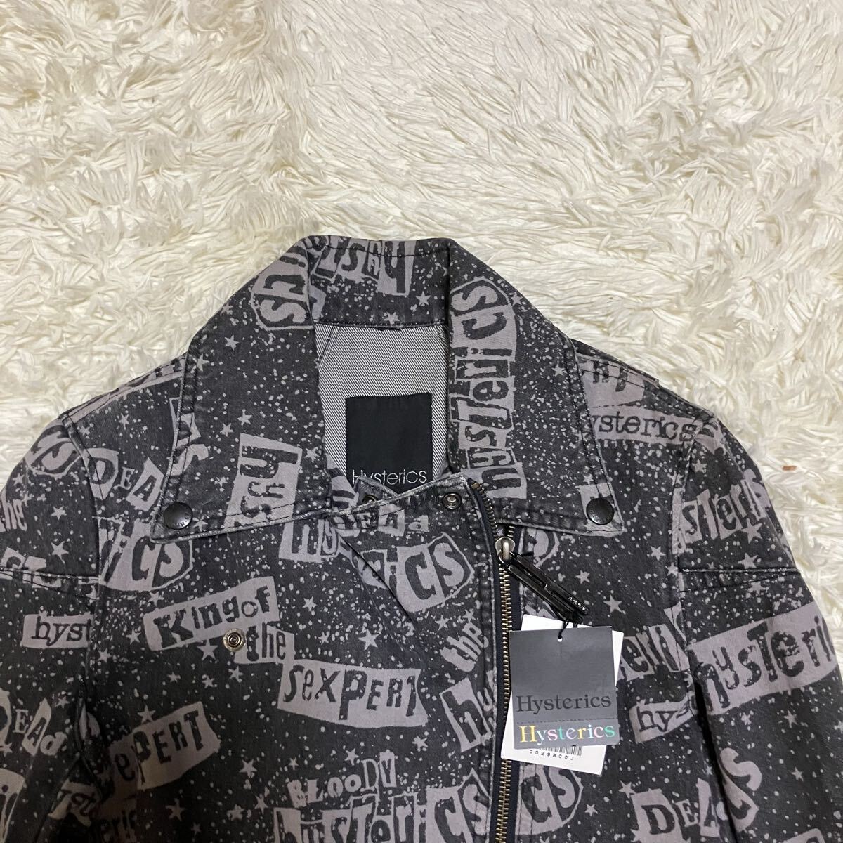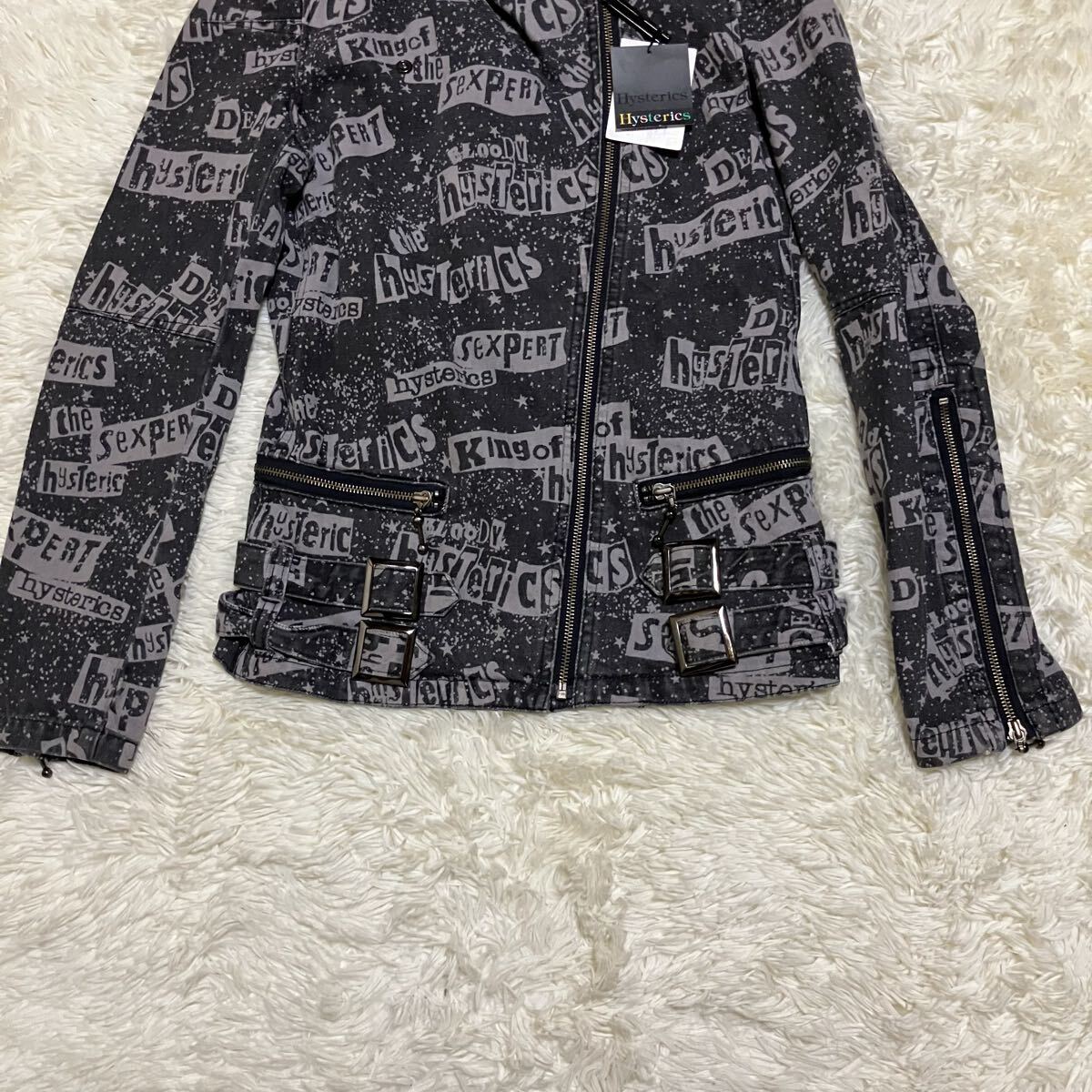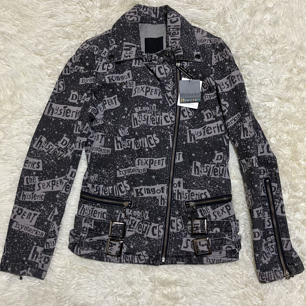 ヒステリックスの総柄、ロゴデザインのデニム生地のダブルライダースです。かなり希少なお品かと思います。未使用タグ付き品です。
