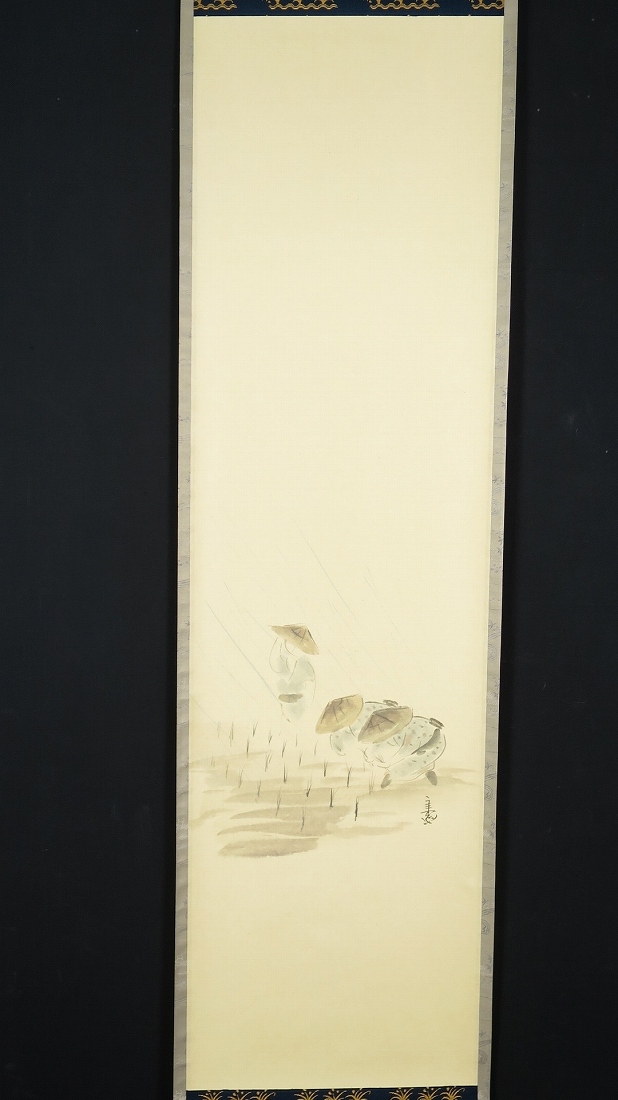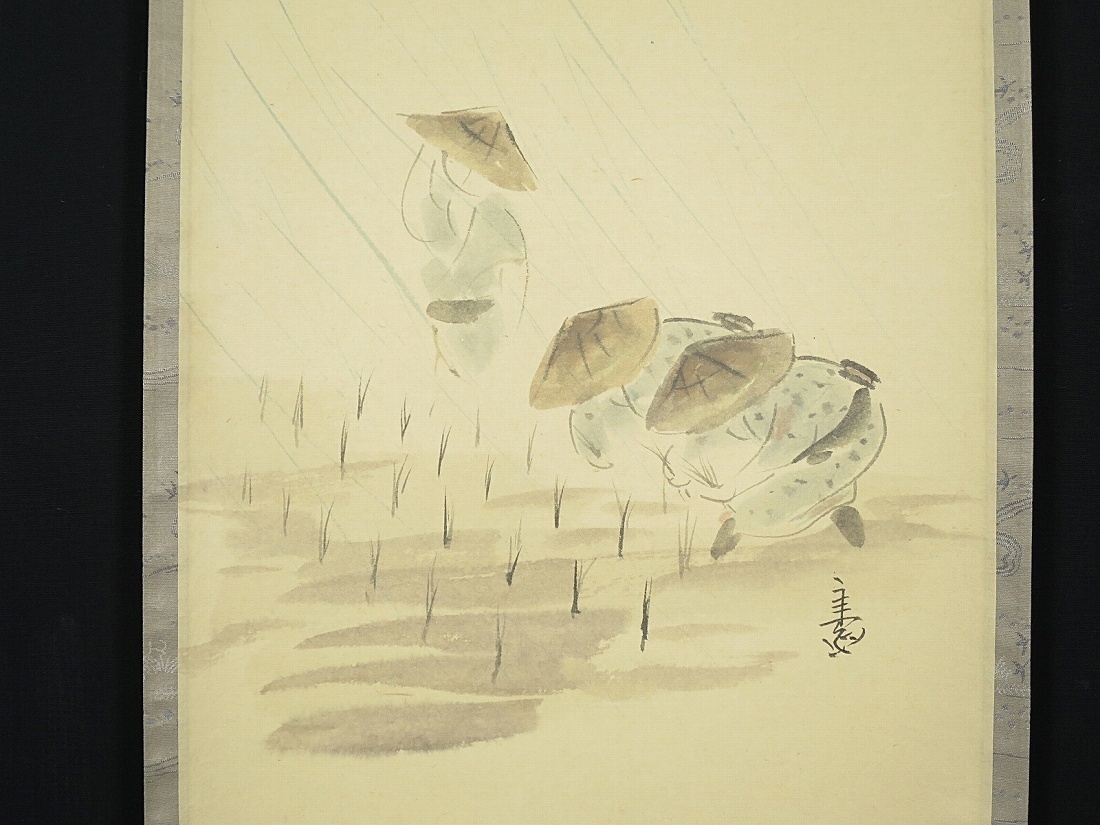 【真作】683【掛軸】小川憲『田植えの図』肉筆 紙本 共箱