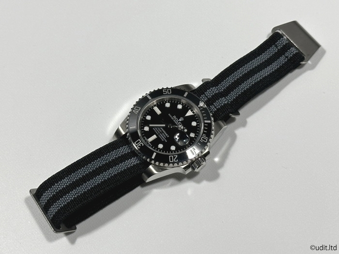 伸縮性のあるスタイリッシュでミリタリー感のある腕時計用ベルトです。