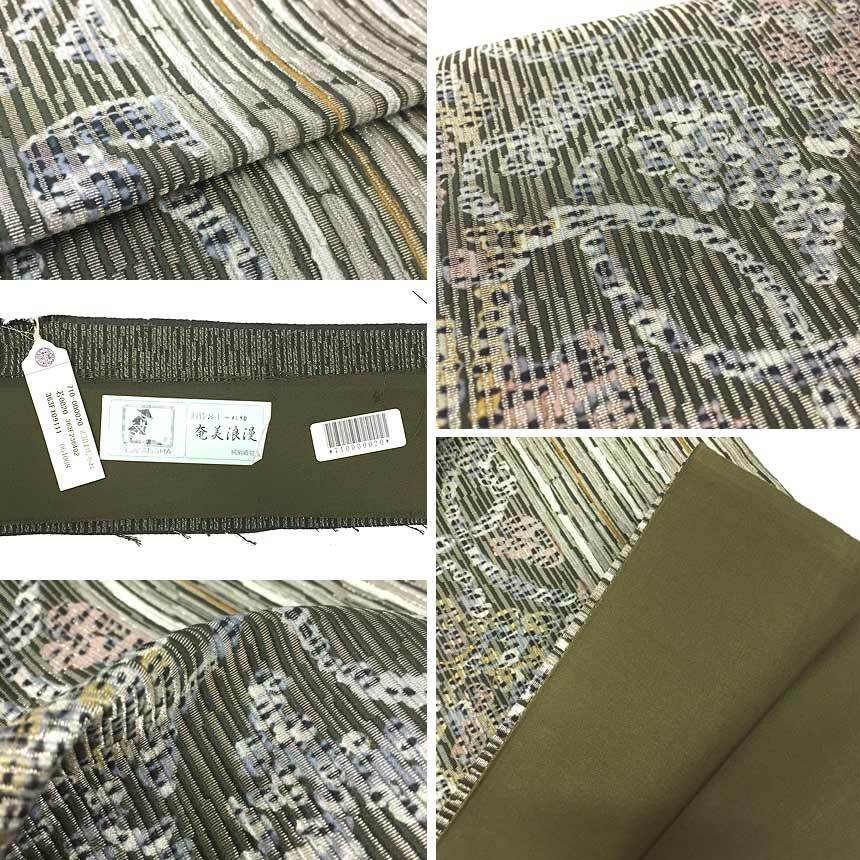| PRコメント | 特選全通袋帯 奄美浪漫 純絹織物 創作おしゃれ紬、洒落袋帯がお仕立て上がり新品未使用にて入荷いたしました。 全通柄は、帯の全面に柄があるため、帯を締めた際に太鼓から胴の脇部分、さらには垂れの部分まで全て柄が見えるようになっています。 そのため、無地の部分を気にせず多種多様な帯結びを行うことができるため、スリムな方もふくよかな方も身長や体型に関係なく締めることができ、融通の利く帯で、コストがかかるため高価な帯です。 シックなカーキ色をベースにモダンな柄を多色で染め上げた逸品です。 金糸も用いて織っているのでモダンな柄行に華やぎを添えています。 訪問着から紬まで幅広いジャンルのお着物に合わせていただけます。 京やJ209 |