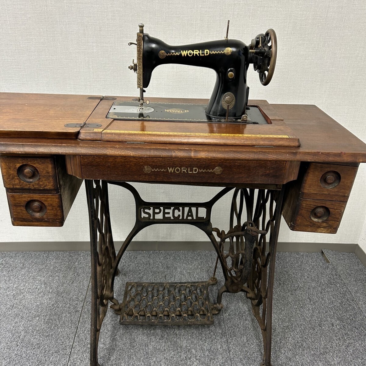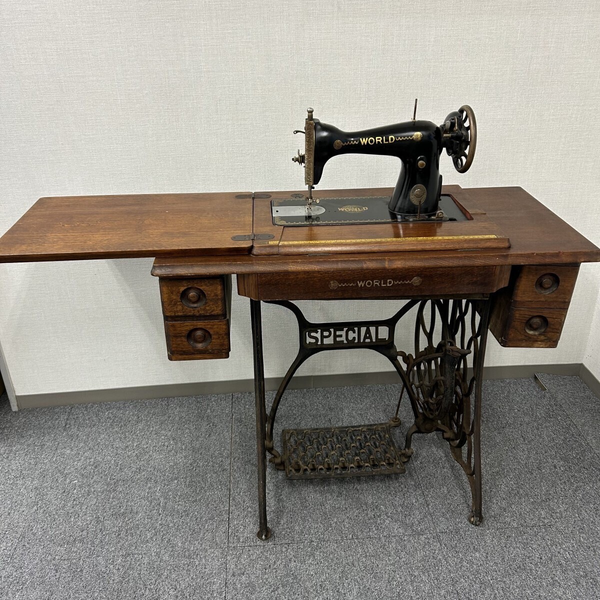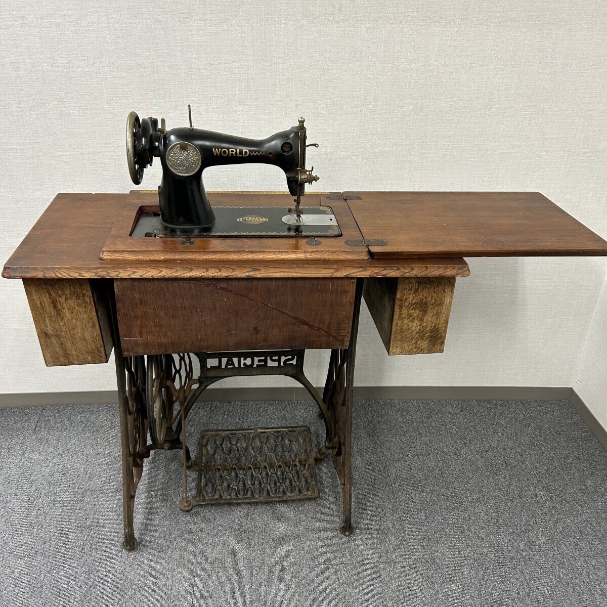 美しい装飾が施されたWORLDの足踏み式ミシンです。